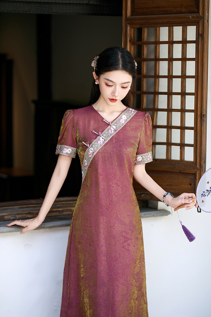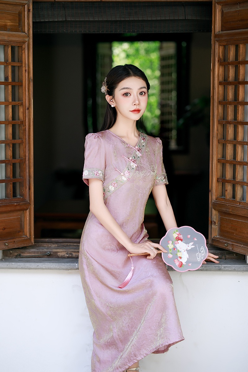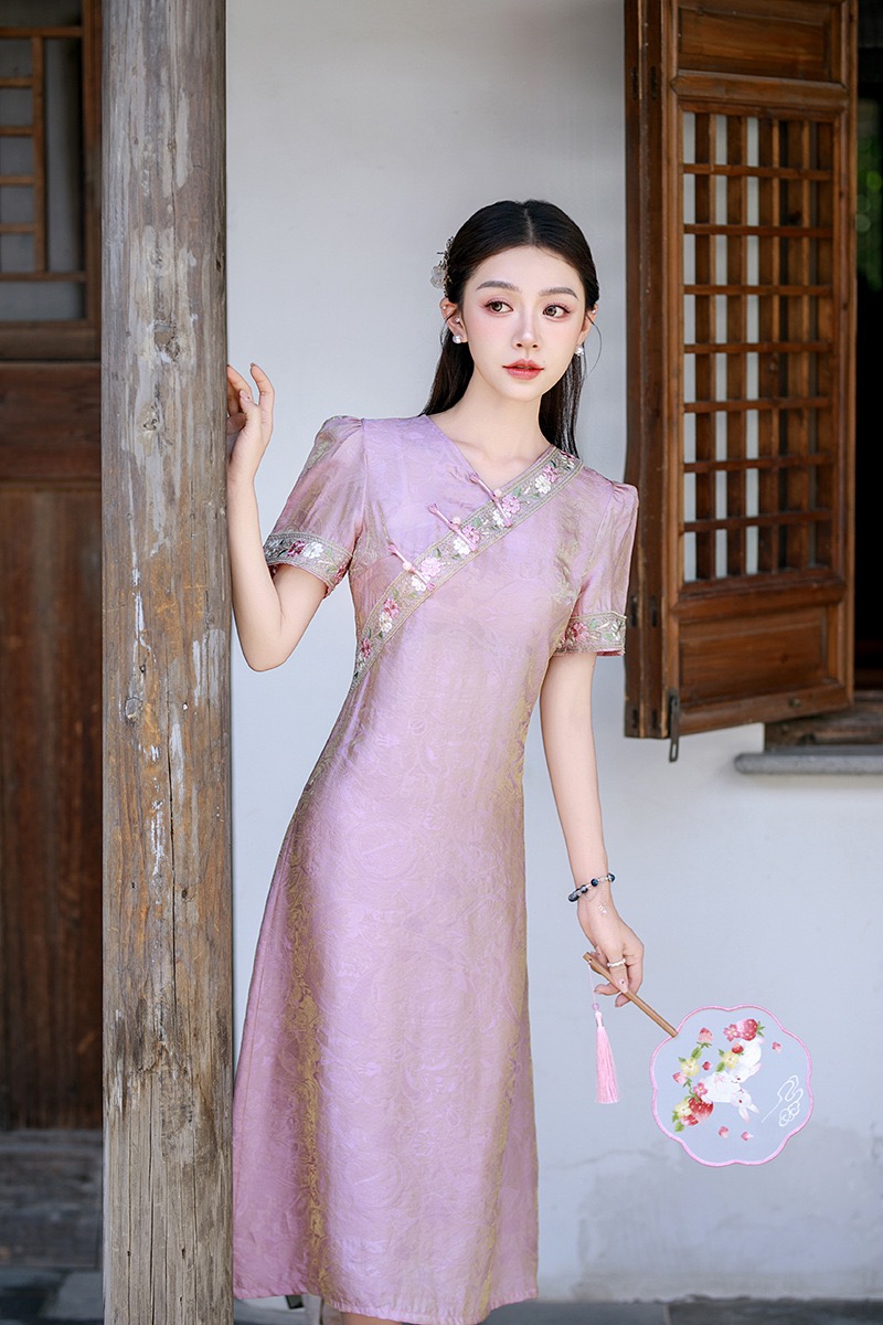 粉色刺绣单层2025夏季新款改良中式日常气质V领日常旗袍连衣裙ZX