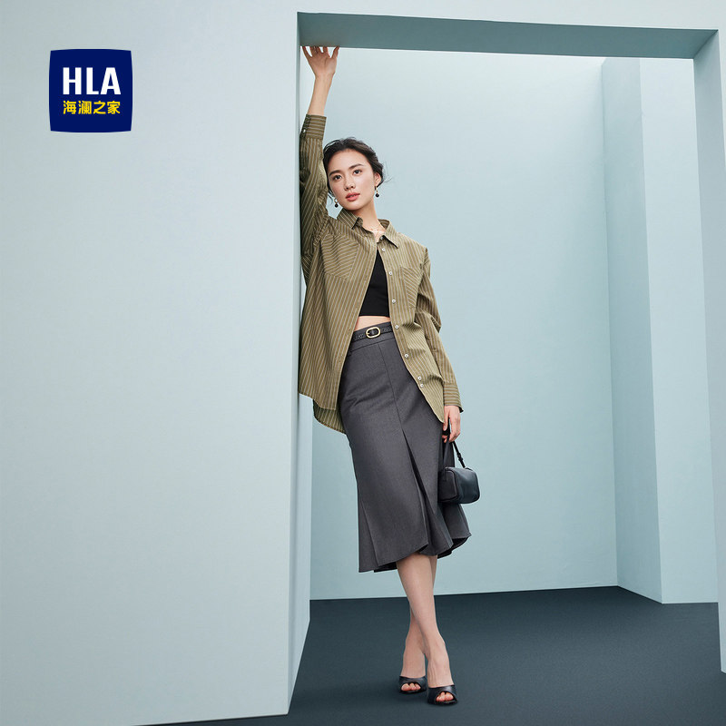 HLA/海澜之家竖条纹长袖休闲翻领衬衫春夏新宽松通勤职业衬衫女装