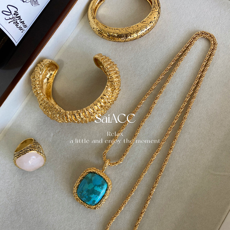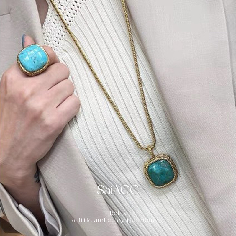 sasa复古天然石方形绿松石粉水晶吊坠长款项链女长款毛衣链高级感