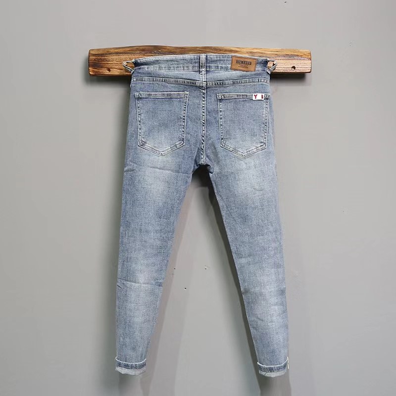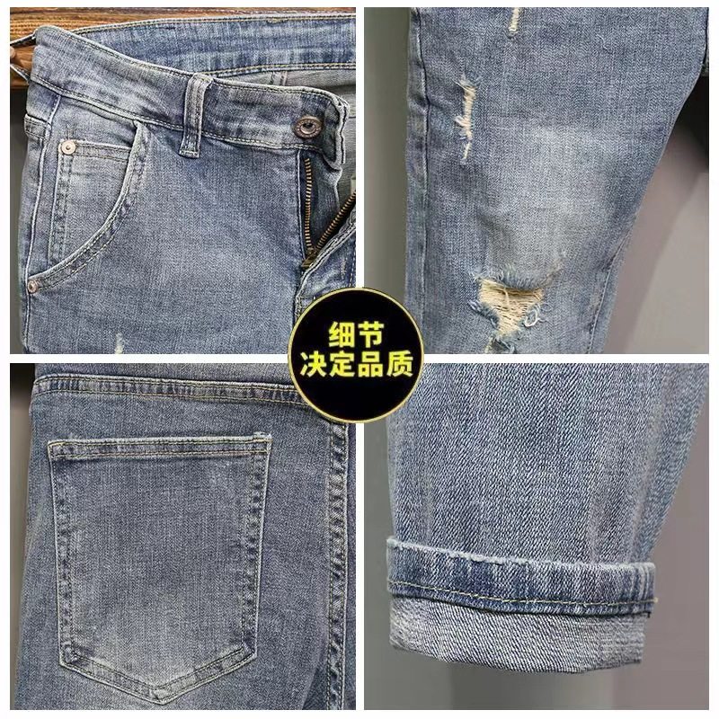 破洞牛仔裤男士潮牌夏季新款斜插口袋修身小脚裤韩版潮流九分裤子