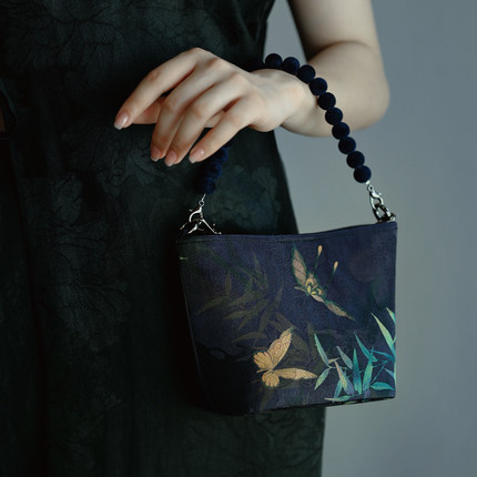 双姊妹原创香云纱绒珍珠链条迷你小包汉服旗袍新中式手拎斜挎包女