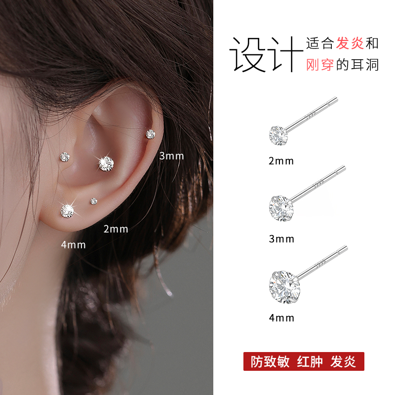 S999纯银钻石耳钉女养耳洞耳棒小耳环耳骨钉男防堵针爆款免摘耳饰