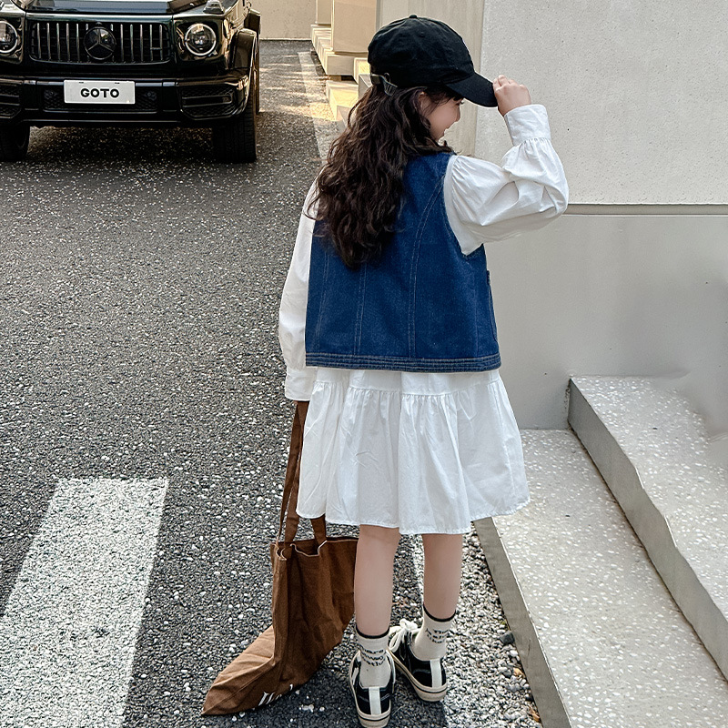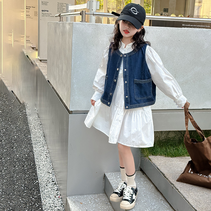 女童春秋牛仔马甲2025新款时髦儿童白色衬衫连衣裙中大童时尚裙子