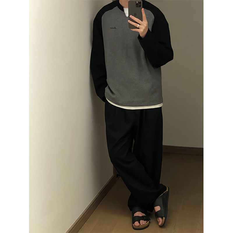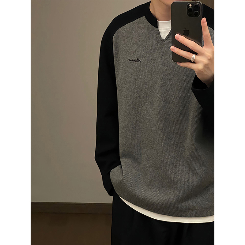 特大码300斤华夫格小v领长袖t恤男春秋潮牌高级感插肩袖卫衣内搭