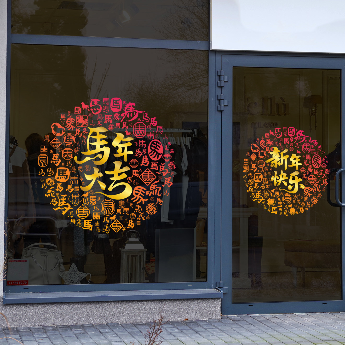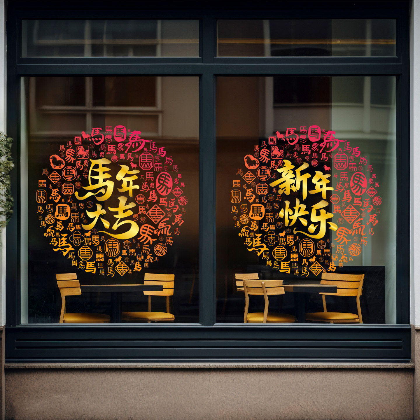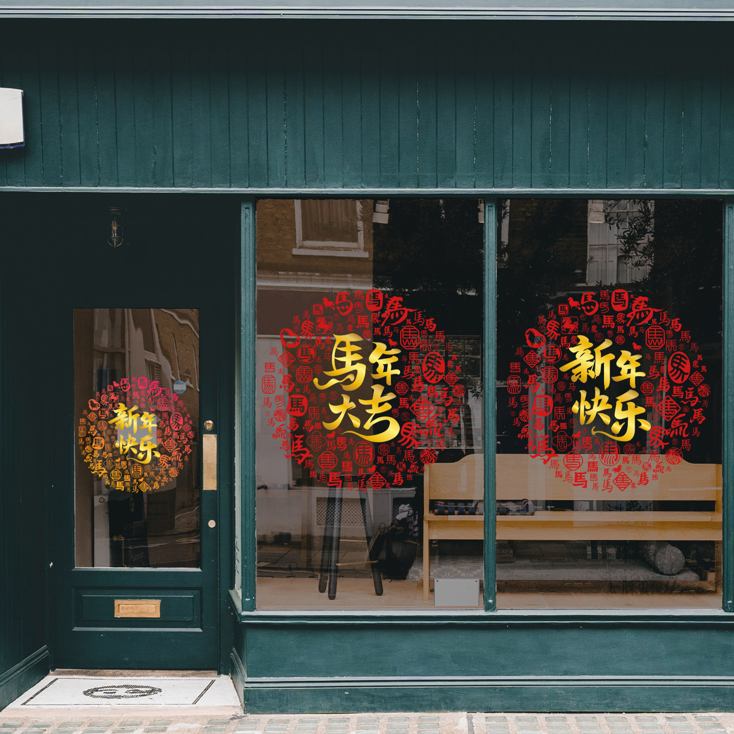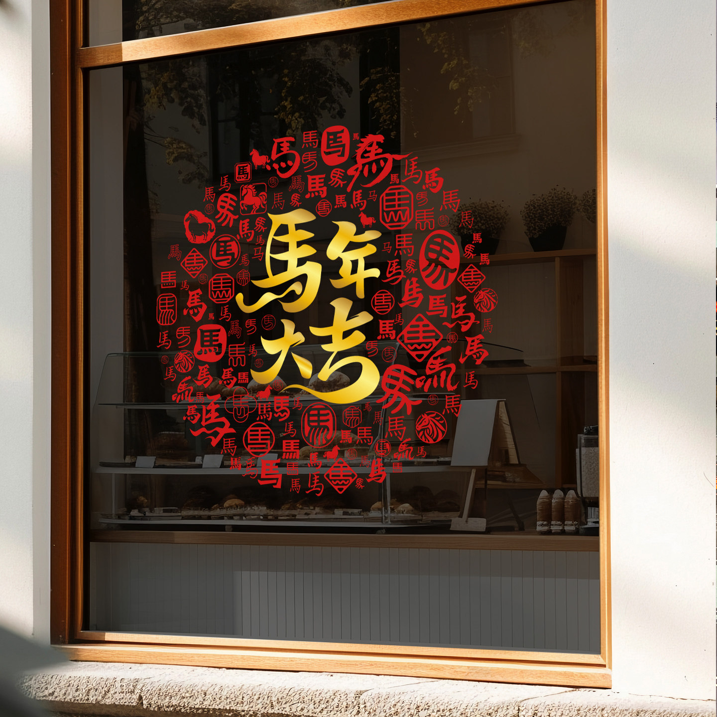 马年大吉新年装饰玻璃静电贴纸中式古典推拉门落地橱窗装饰窗贴纸