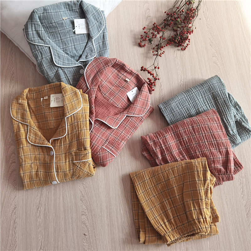 纯棉皱褶纱布水洗棉套装长袖长裤男女情侣款睡衣春秋夏软糯吸汗