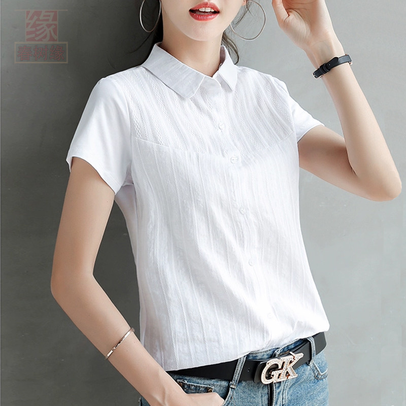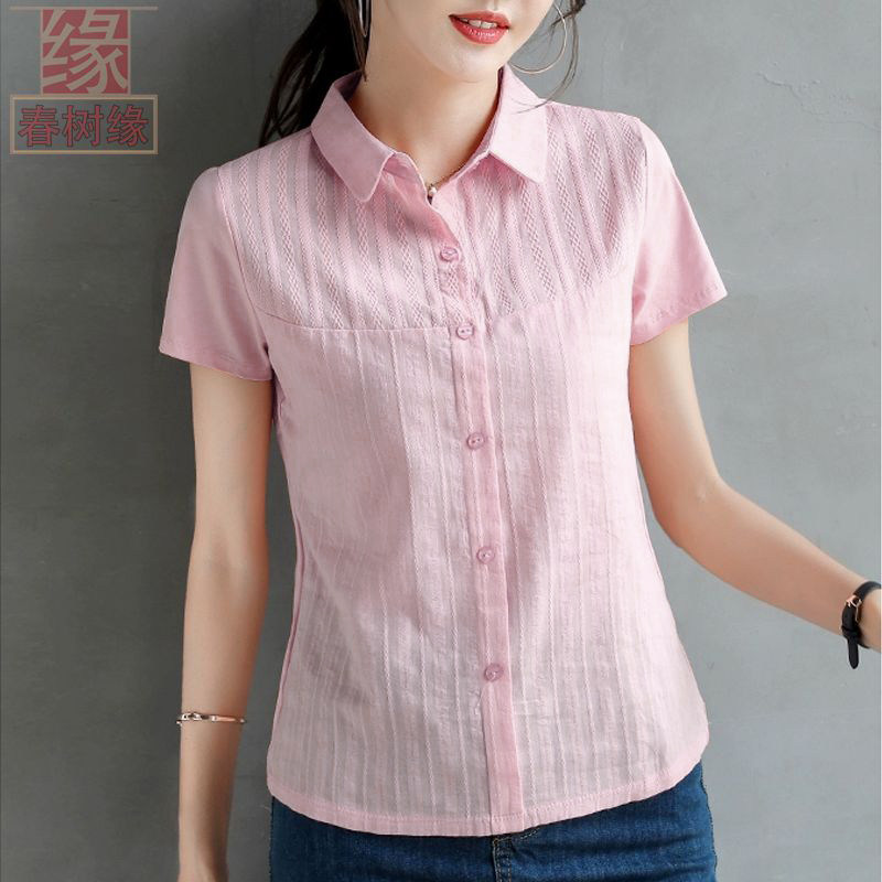 粉色短袖套头衬衫女夏装薄款气质polo领纯棉t恤纯色拼接宽松上衣