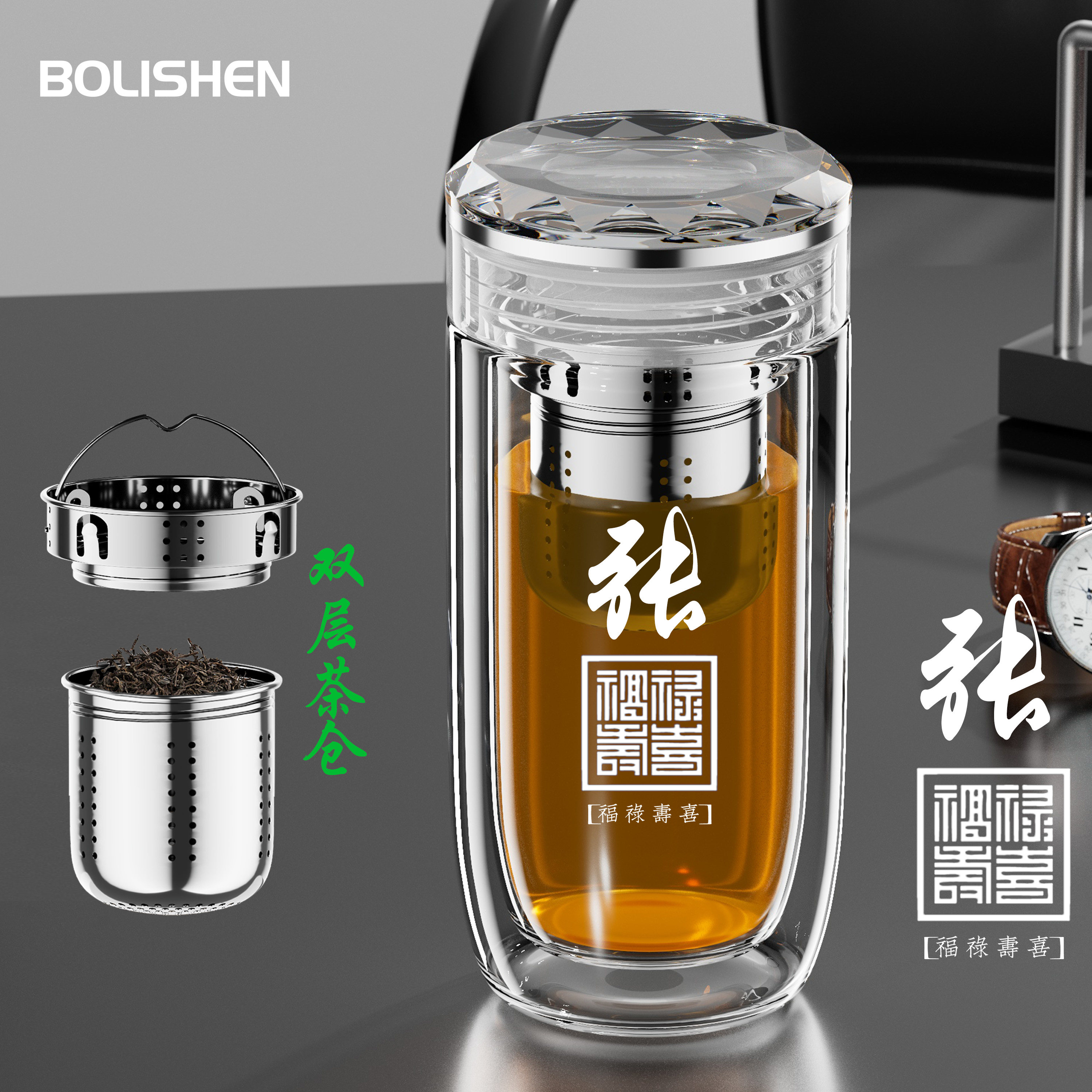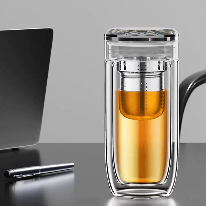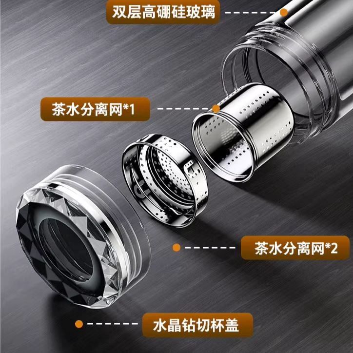 博力神男士高档水晶鹅蛋双层玻璃杯茶水分离商务办公室防烫泡茶杯