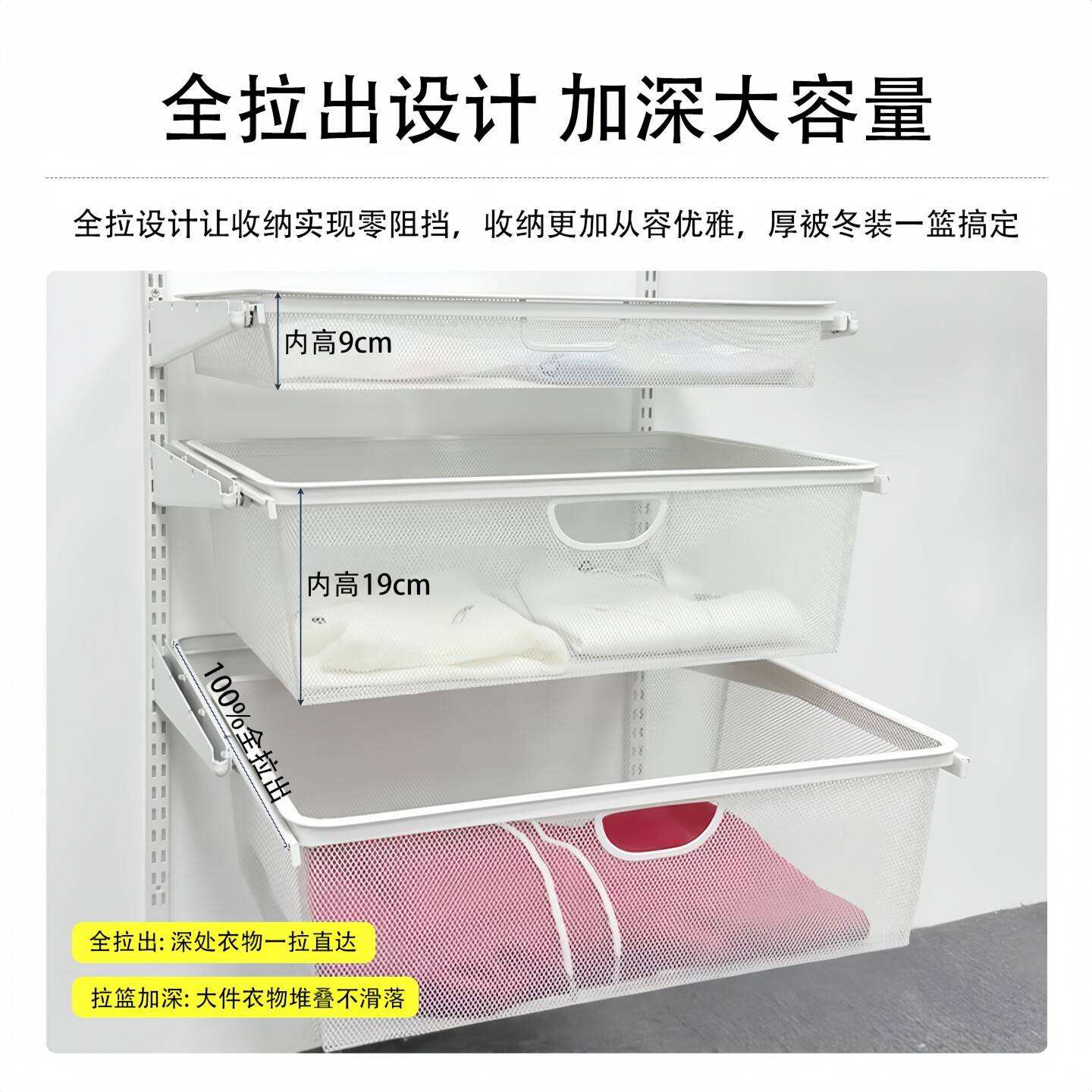 金属衣柜配件新款加厚抽拉网篮阻尼静音分段式收纳篮衣橱抽屉