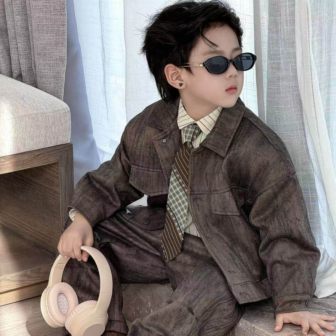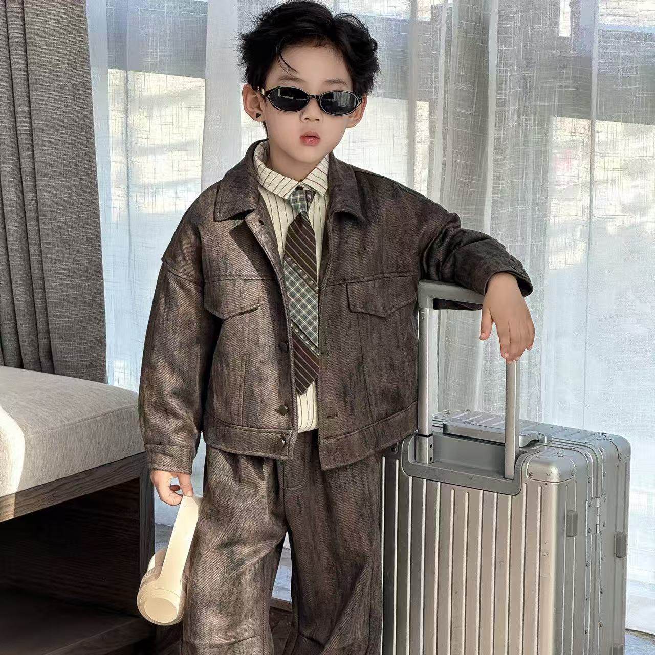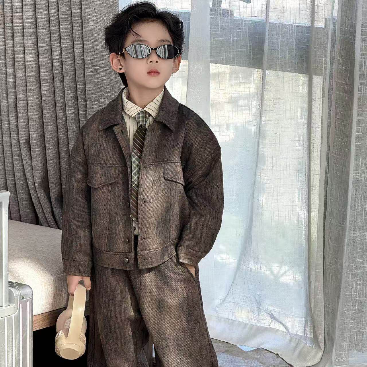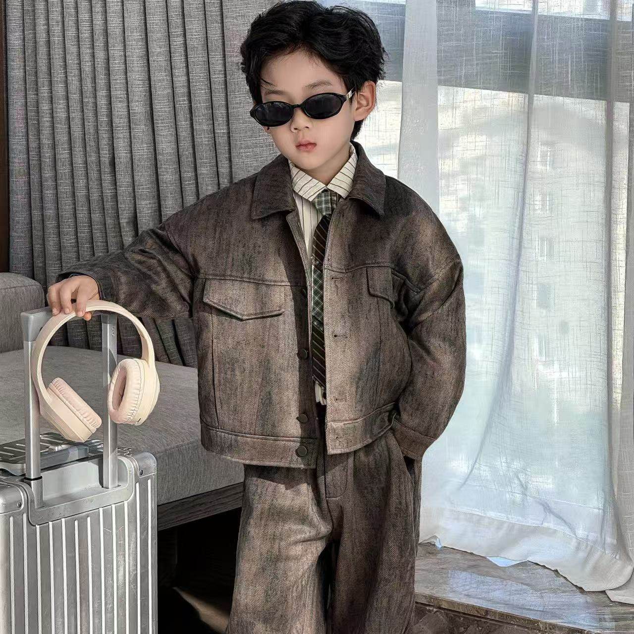 男童休闲套装童装2025冬装新款韩版扎染加厚儿童夹克两件套中大童