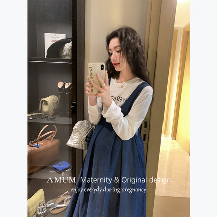 ◆AMUM孕妇装◆简约气质~藏青背带连衣裙秋装叠穿无袖显瘦百褶裙