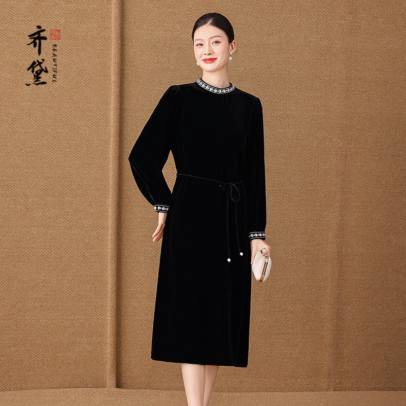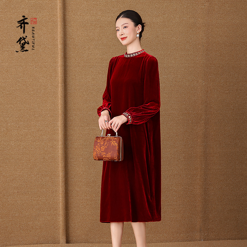 齐黛红色丝绒连衣裙女2025秋季新款长袖喜婆婆婚宴礼服妈妈真丝裙