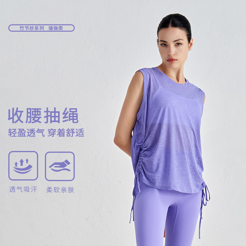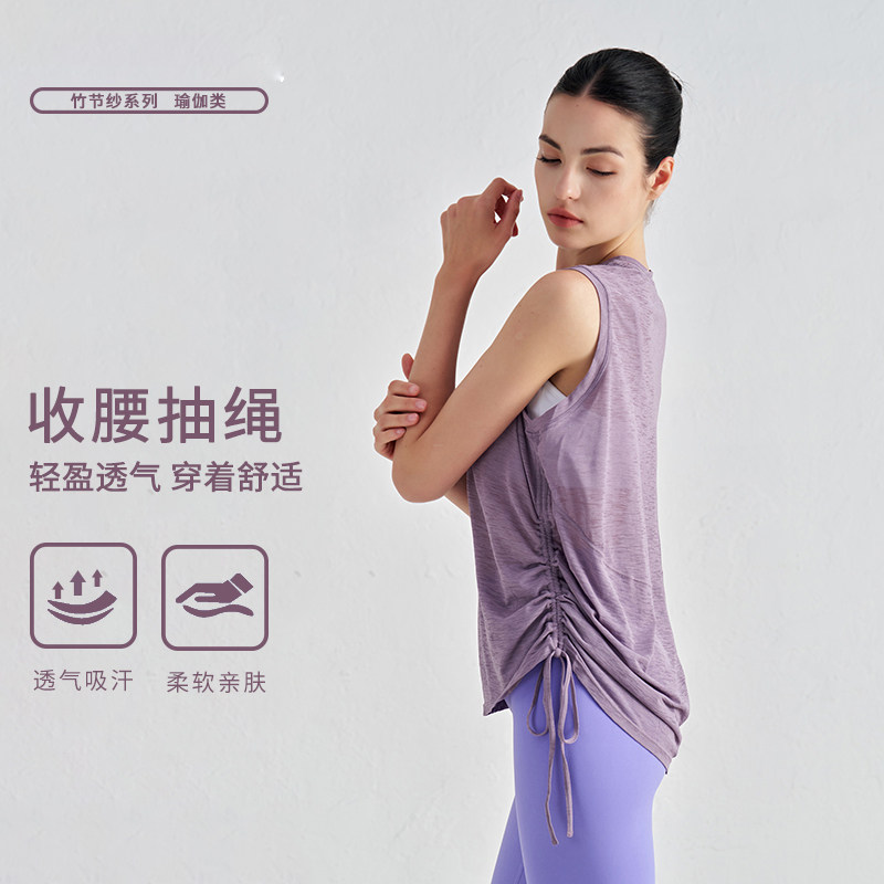 夏季竹节纱瑜伽服T恤健身运动背心女抽绳无袖透气宽松圆领上衣