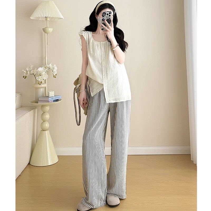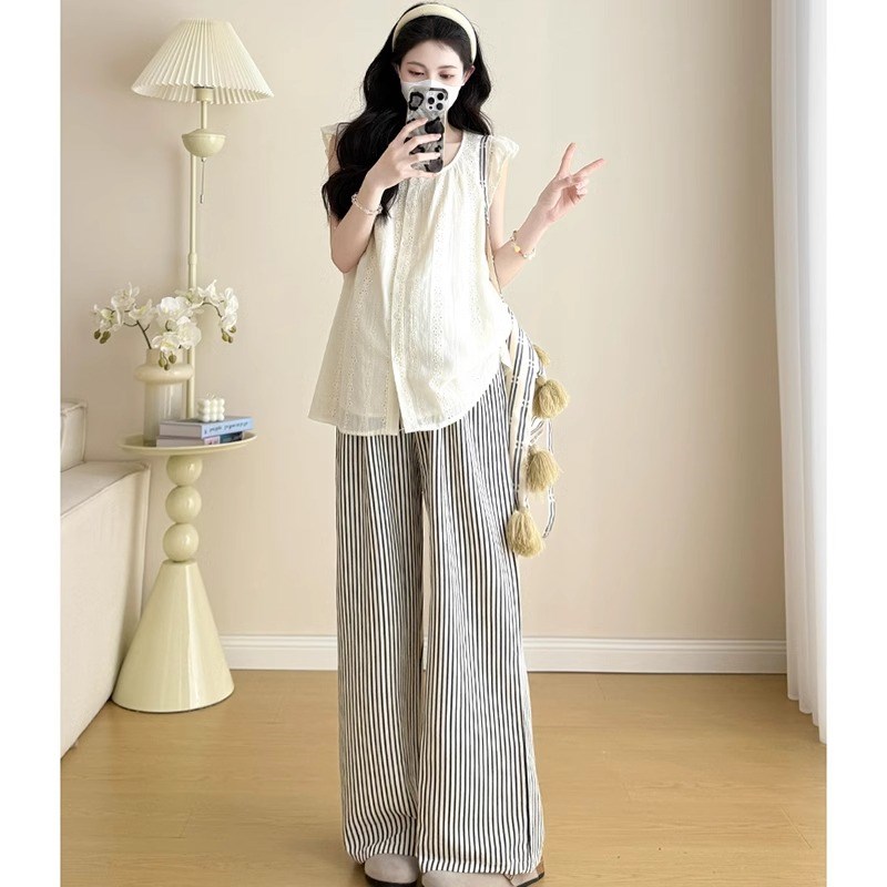 孕妇套装夏季20k25新款时尚洋气小飞袖上衣休闲条纹阔腿裤两件套