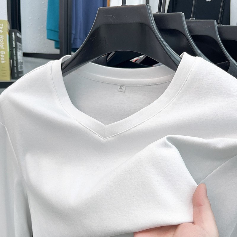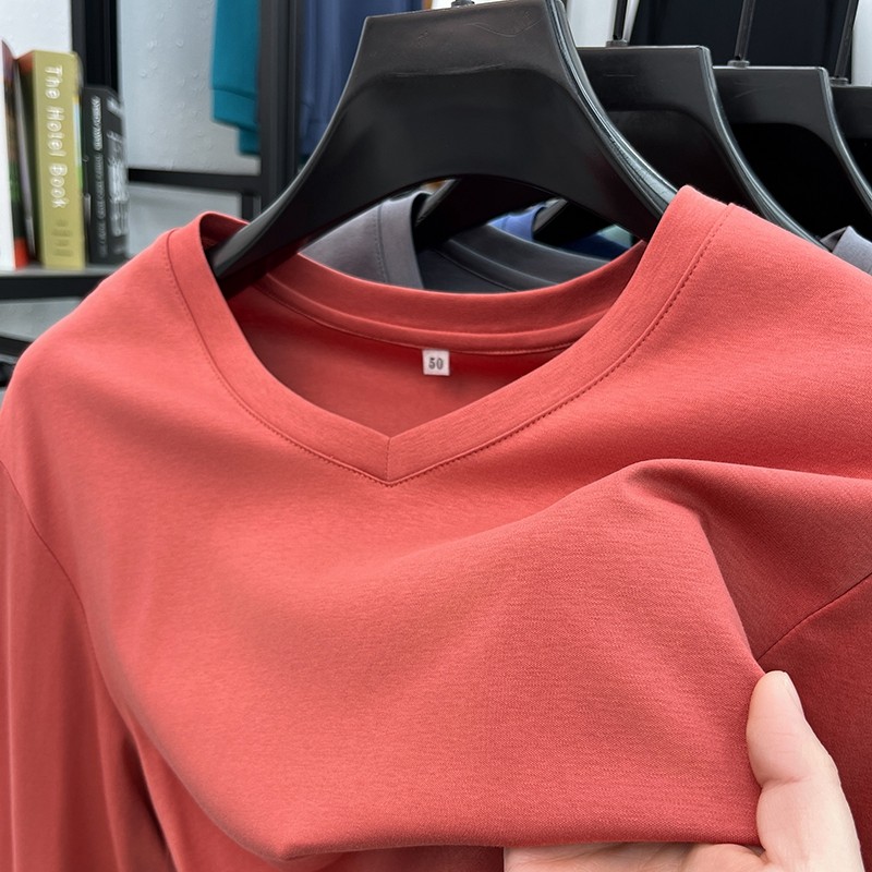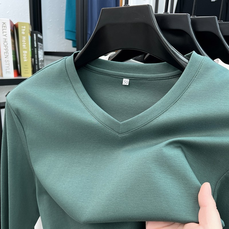 【100支双丝光棉】男士100%纯棉V领长袖T恤纯色宽松鸡心领体恤衫