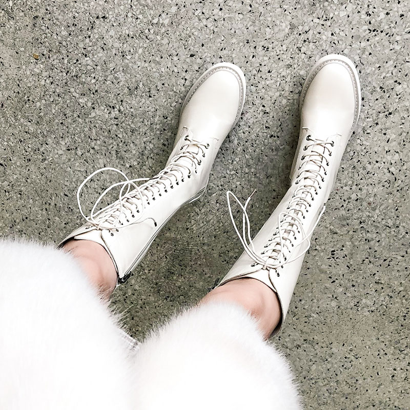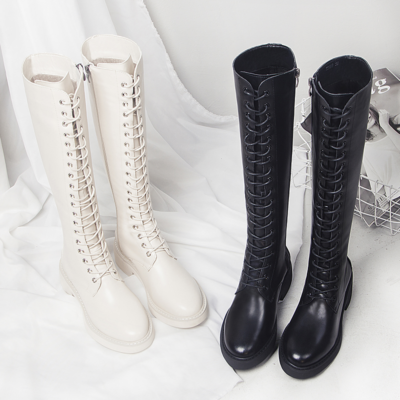 秋冬季不过膝女高靴网红白色显瘦绑带中筒马丁靴厚底平跟骑士长靴