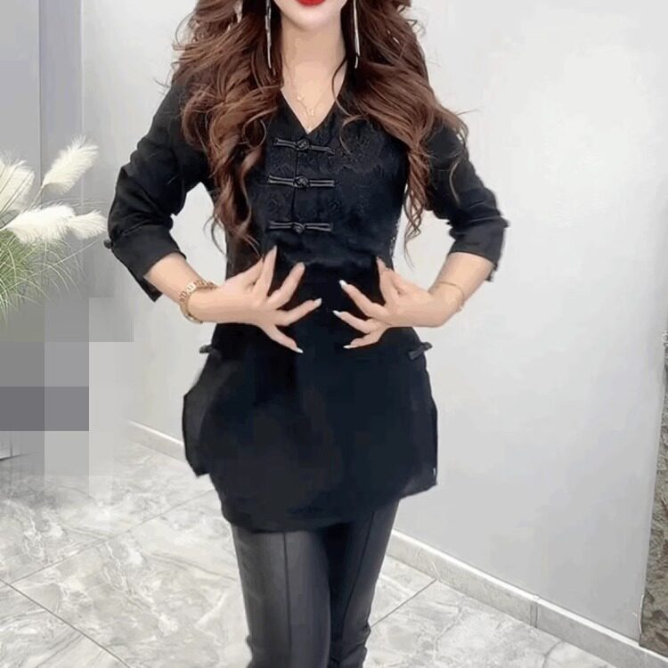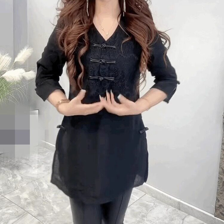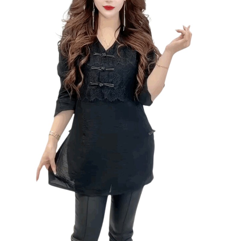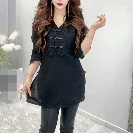 气质雪纺蕾丝中长款t恤打底衫女七分袖复古盘扣新中式V领黑色上衣