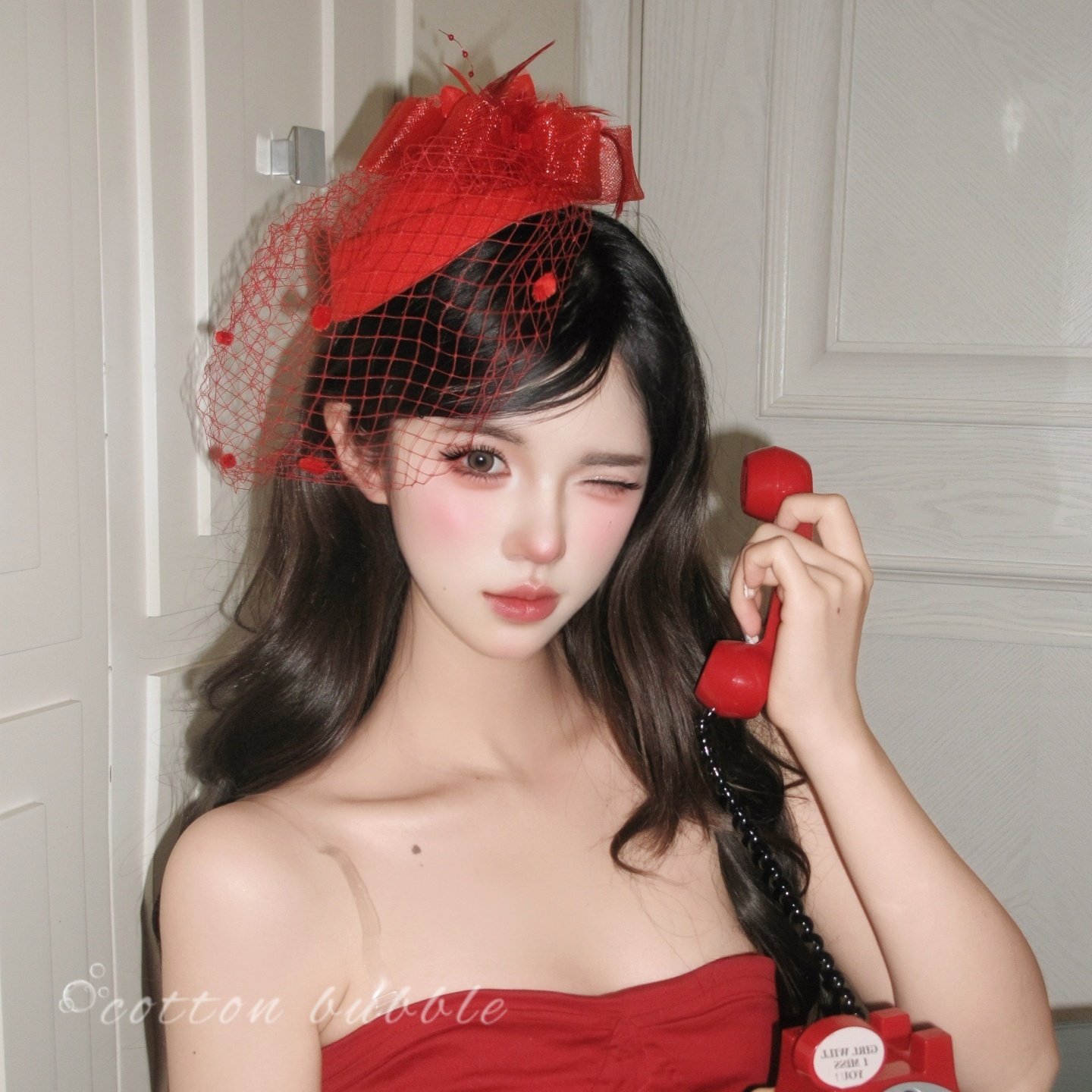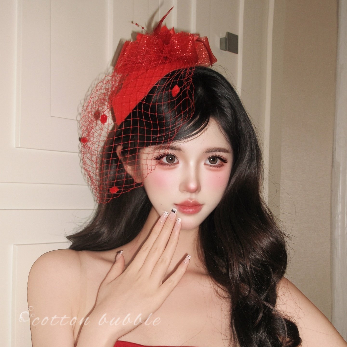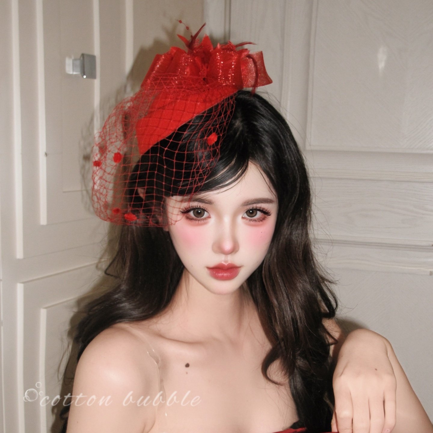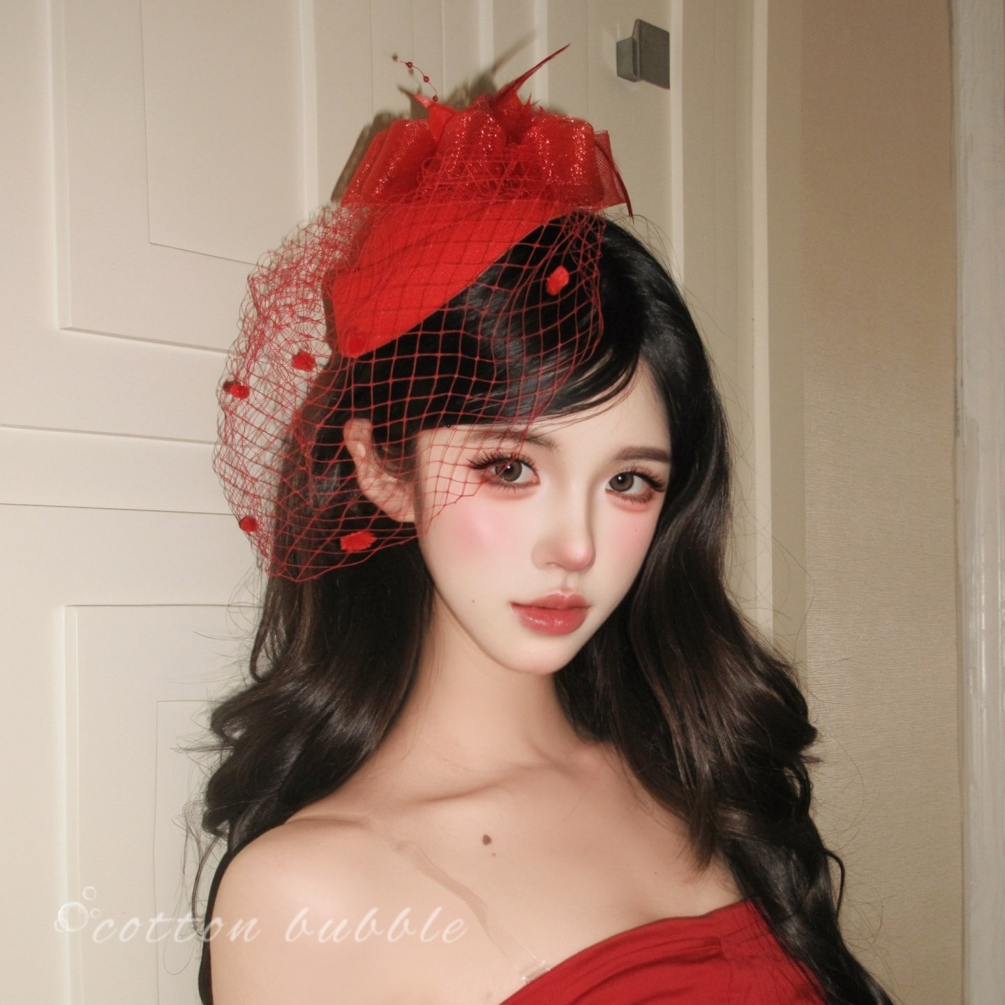 明艳千金红色网纱礼帽头饰复古新娘头纱生日帽子新年礼服配饰发饰