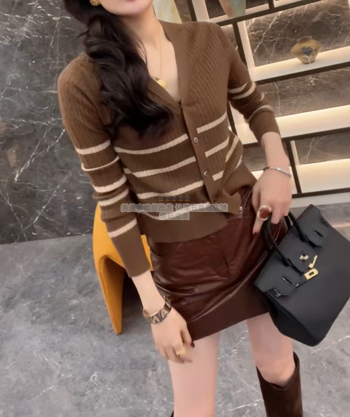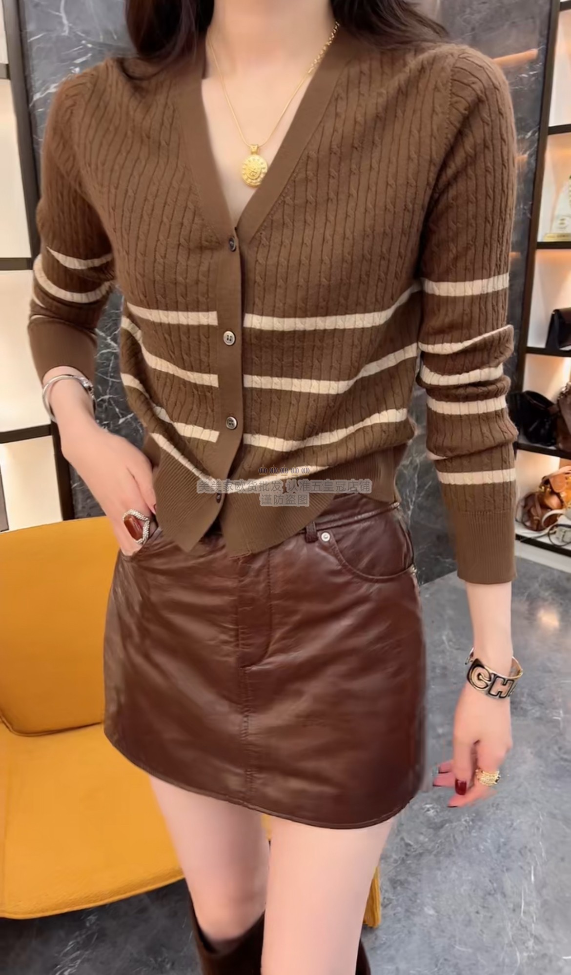 欧货2025秋装新款时尚 V领条纹长袖针织开衫修身显瘦百搭毛衣外套