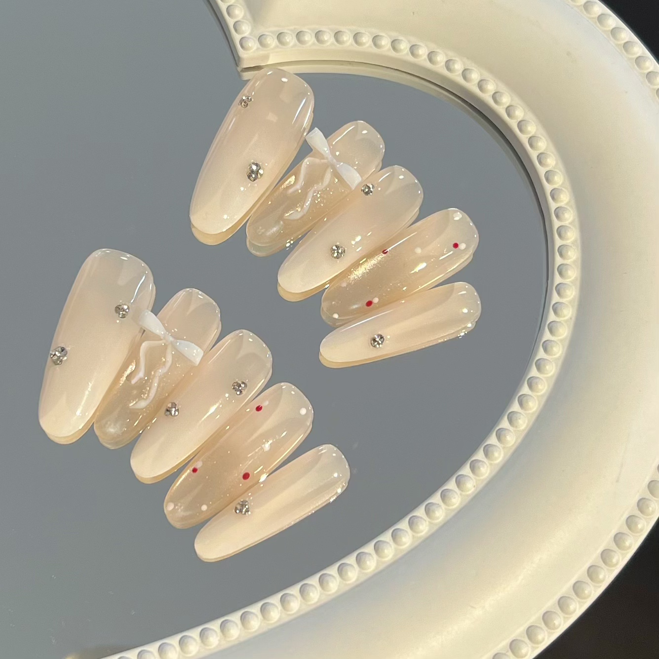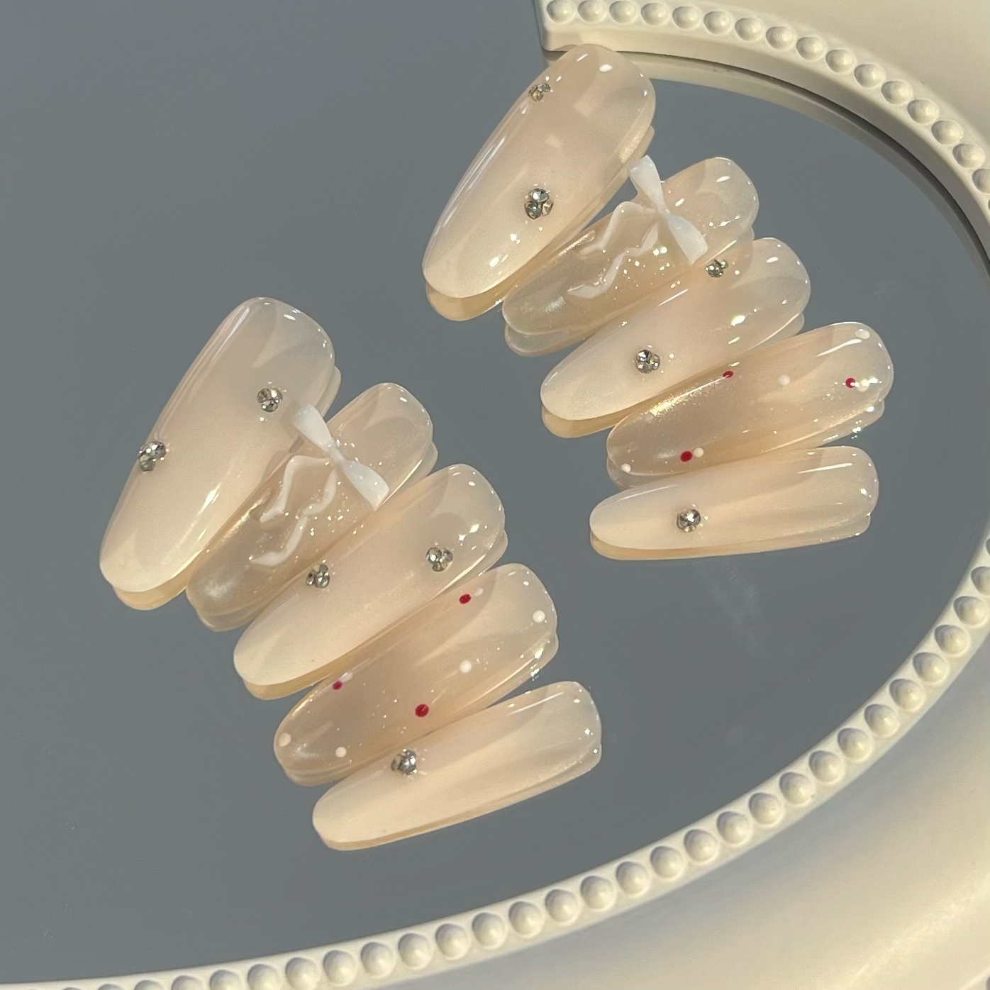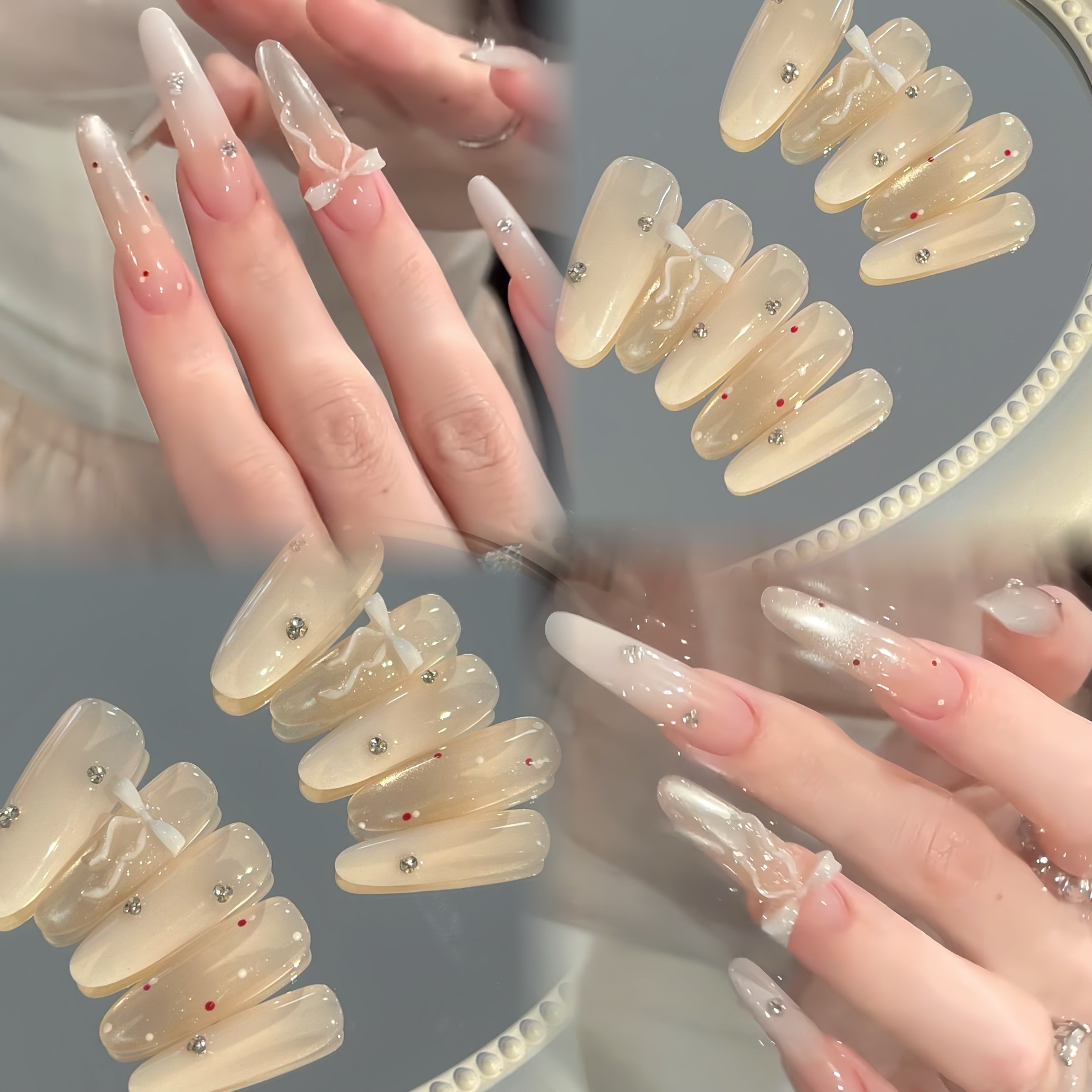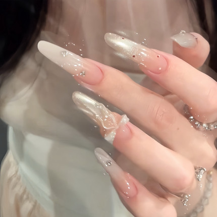 纯手工乳白渐变玻璃珠飘带蝴蝶结美甲穿戴甲长款2025新款氛围感
