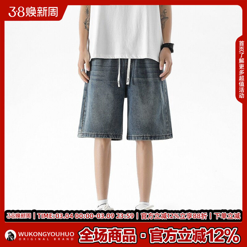 悟空有货潮牌抽绳松紧腰水洗牛仔短裤男女复古夏季宽松百搭五分裤