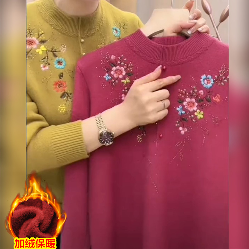 妈妈冬装毛衣加绒加厚保暖内搭上衣服中老年女半高领一体绒打底衫