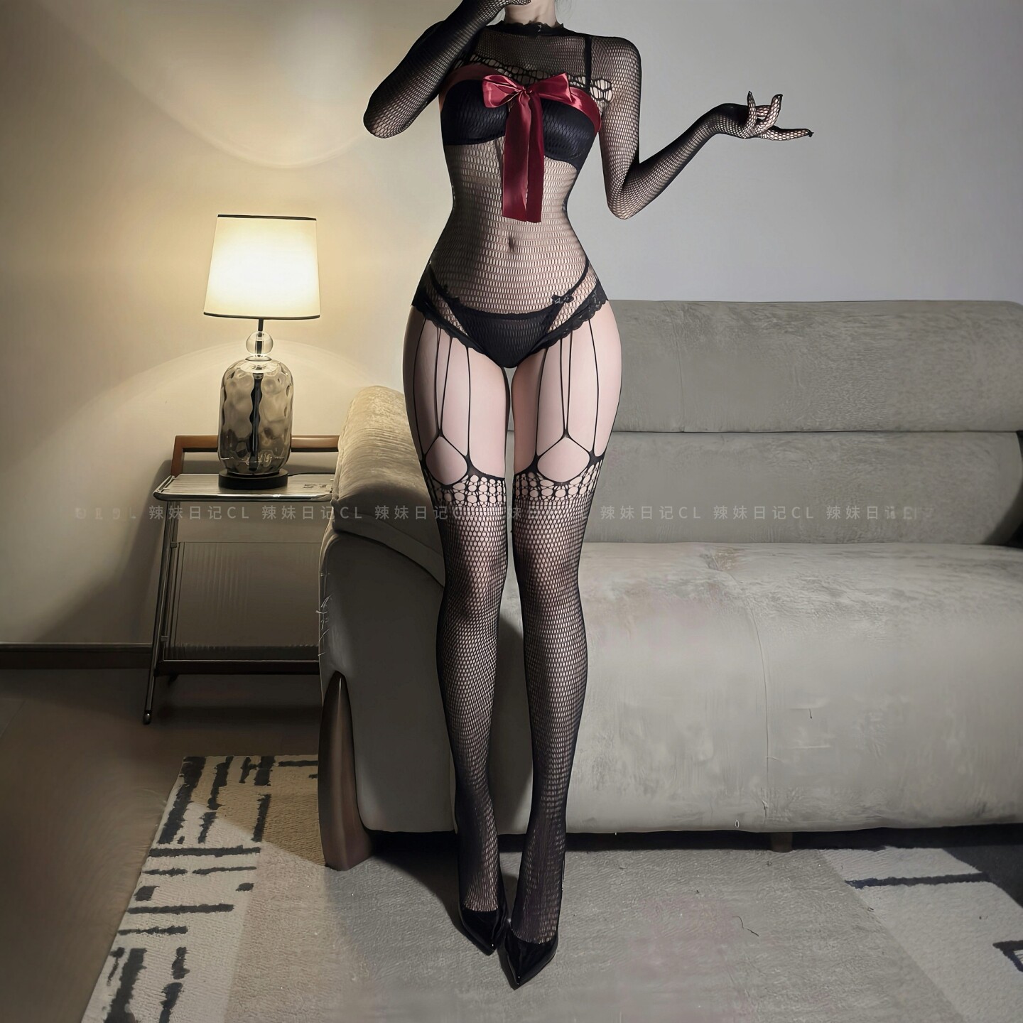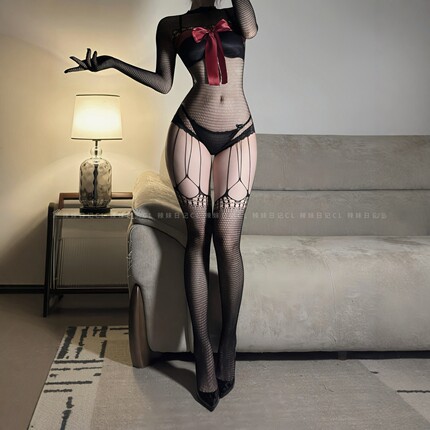 辣妹日记CL「化蝶」蝴蝶结全包带手丝渔网袜连体丝袜长袖紧身衣女