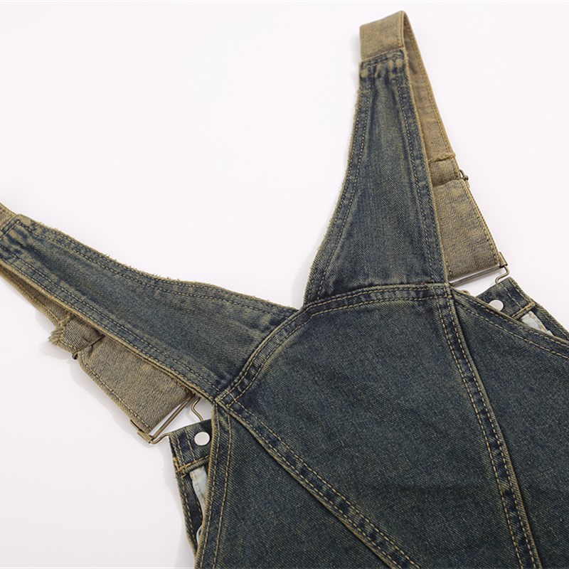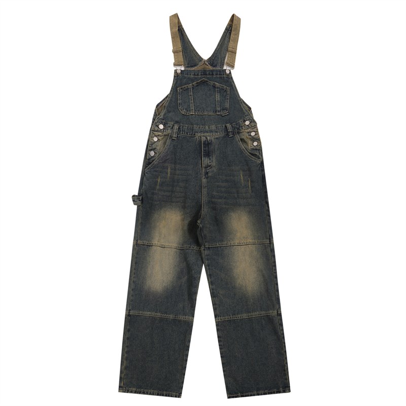 美式街头重磅做旧水洗工装牛仔背带裤男女宽松连体工装阔腿直筒裤