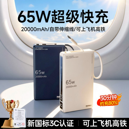 新国标3C认证丨remax睿量充电宝20000毫安大容量自带线65W大功率笔记本电脑快充适用苹果17MacBook飞机可携带