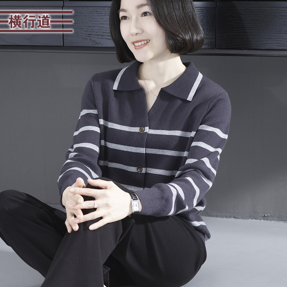 2025新款秋装翻领条纹宽松针织开衫女装上衣大码显瘦条纹妈妈外套