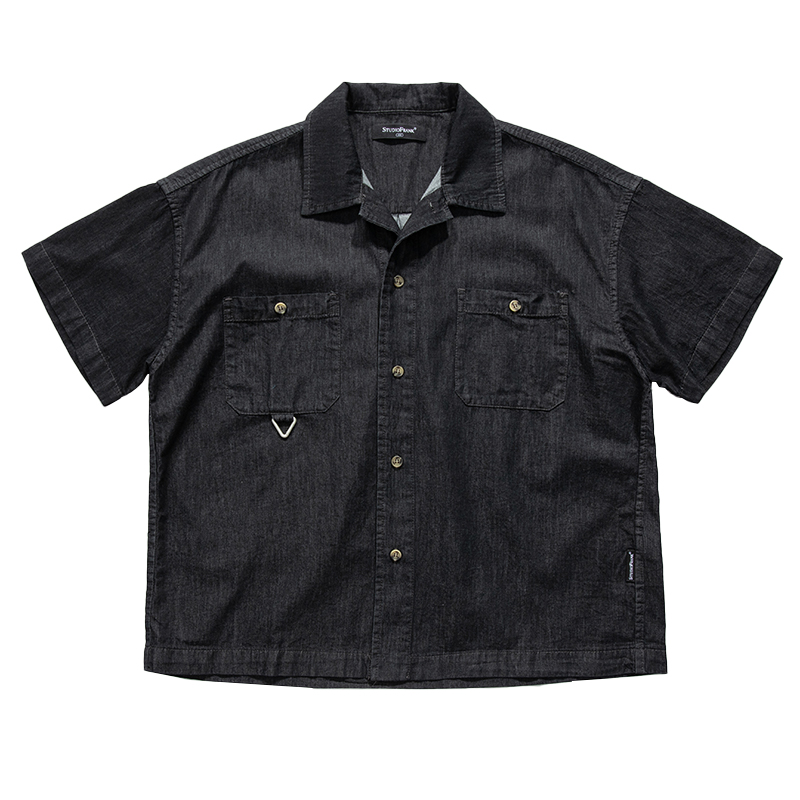 美式复古水洗做旧牛仔短袖衬衫男夏季新款宽松质感翻领工装衬衣潮
