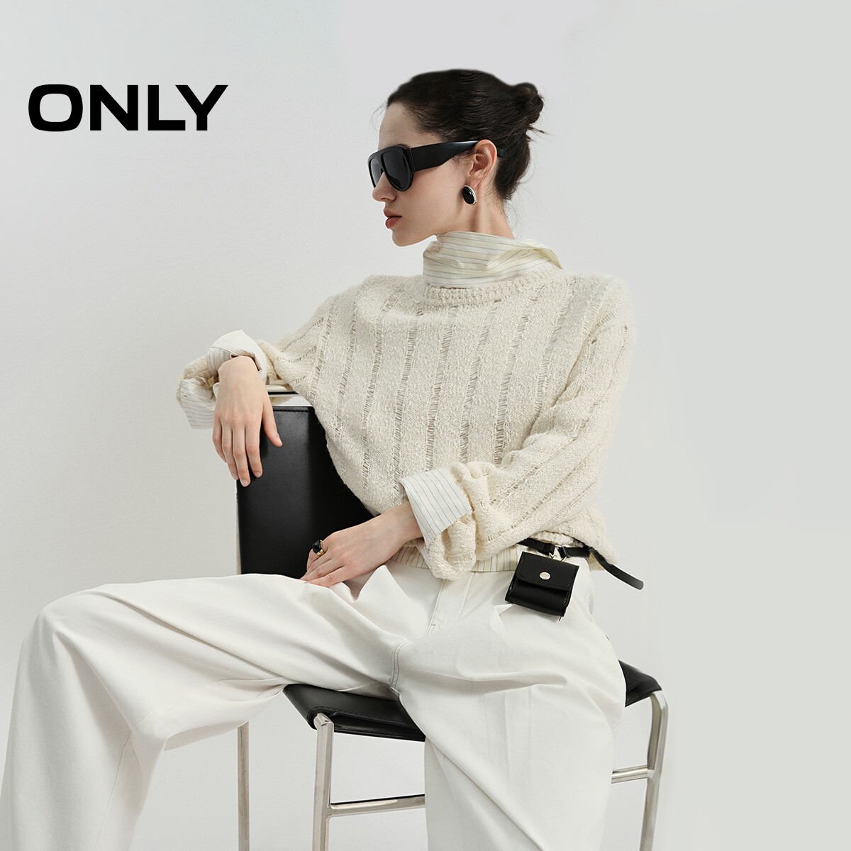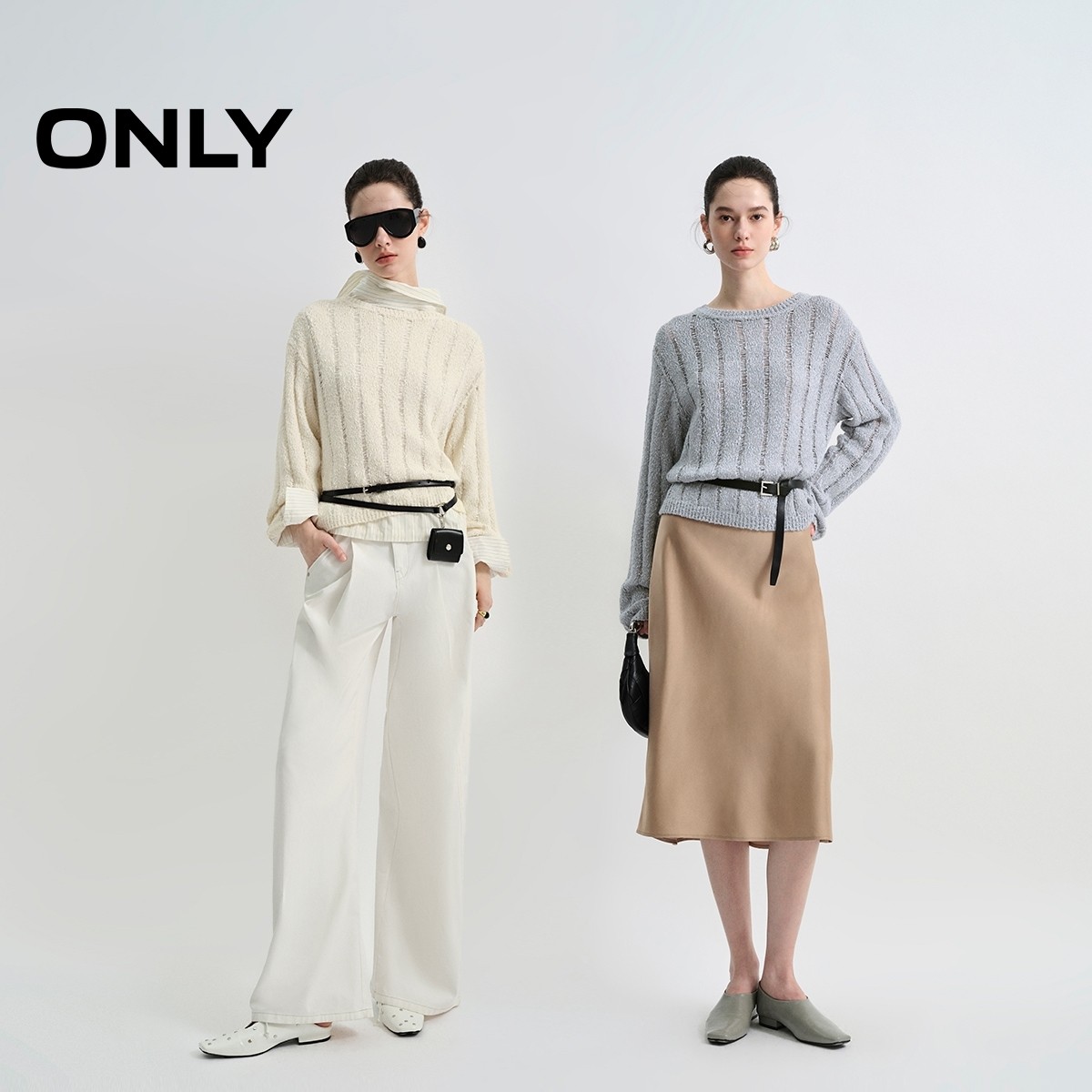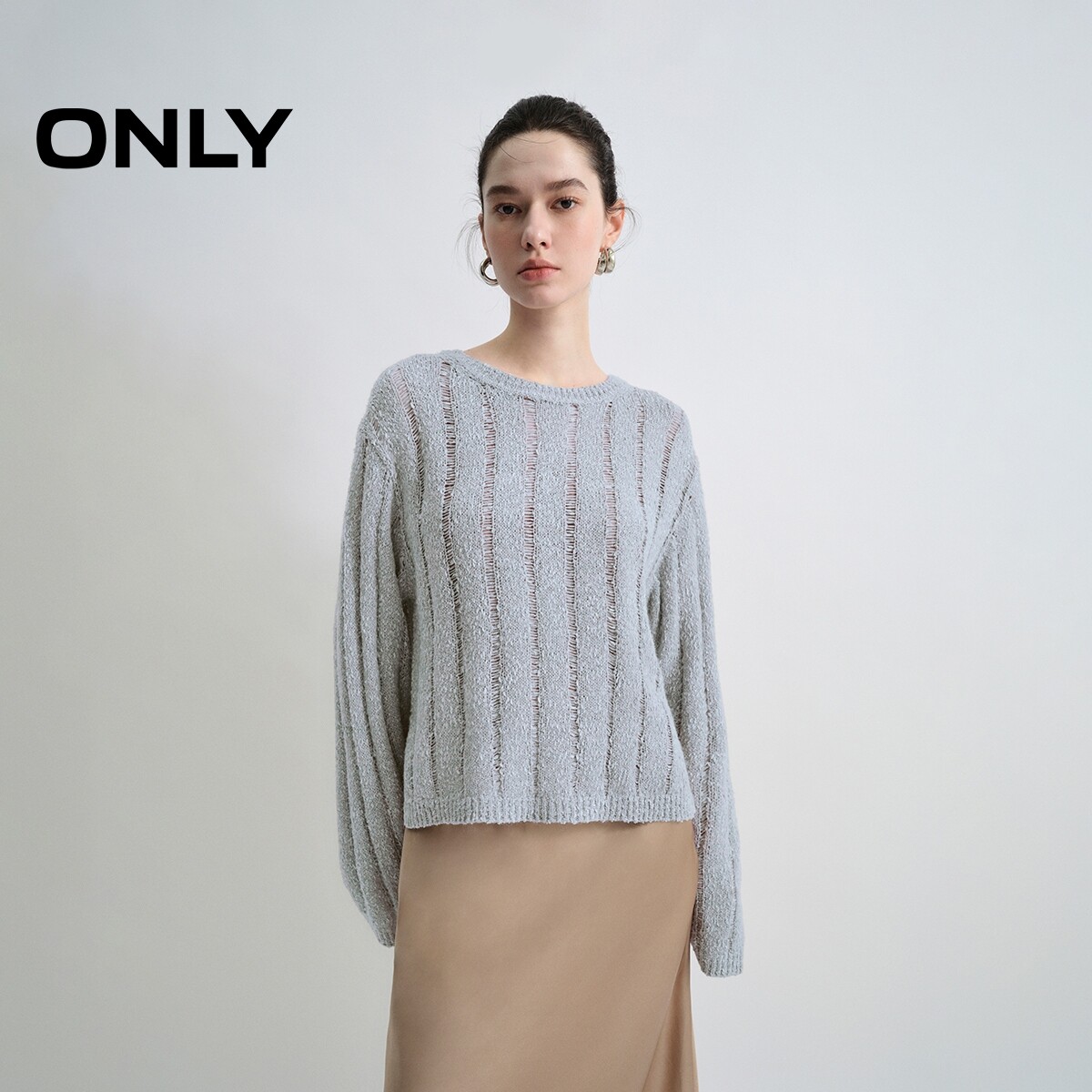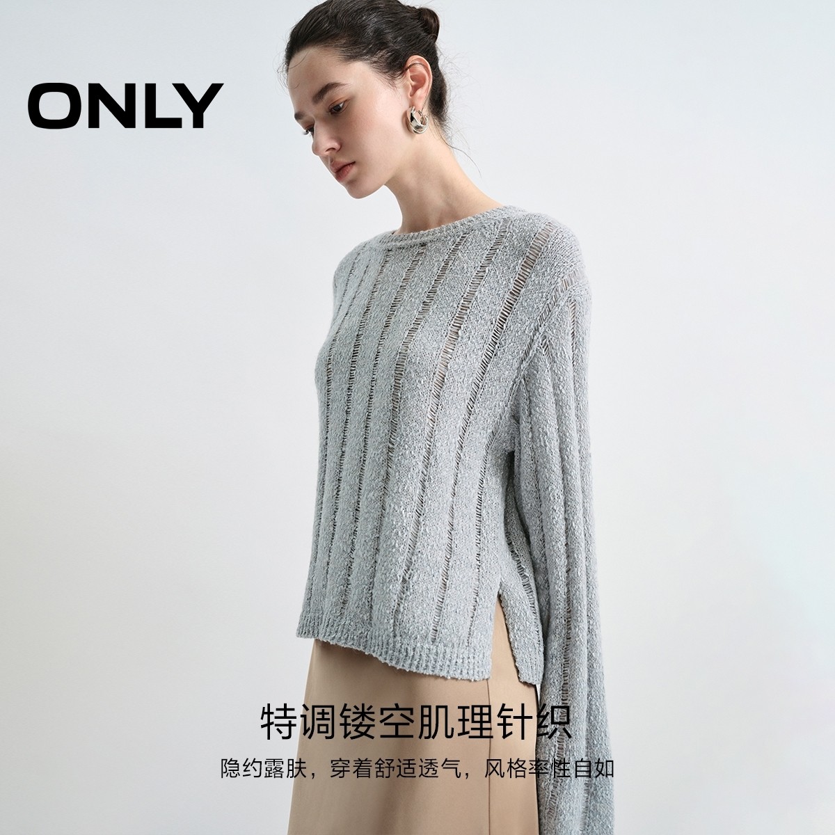 ONLY2025冬季新款开衩设计镂空肌理透气亲肤纯色松弛落肩针织衫女