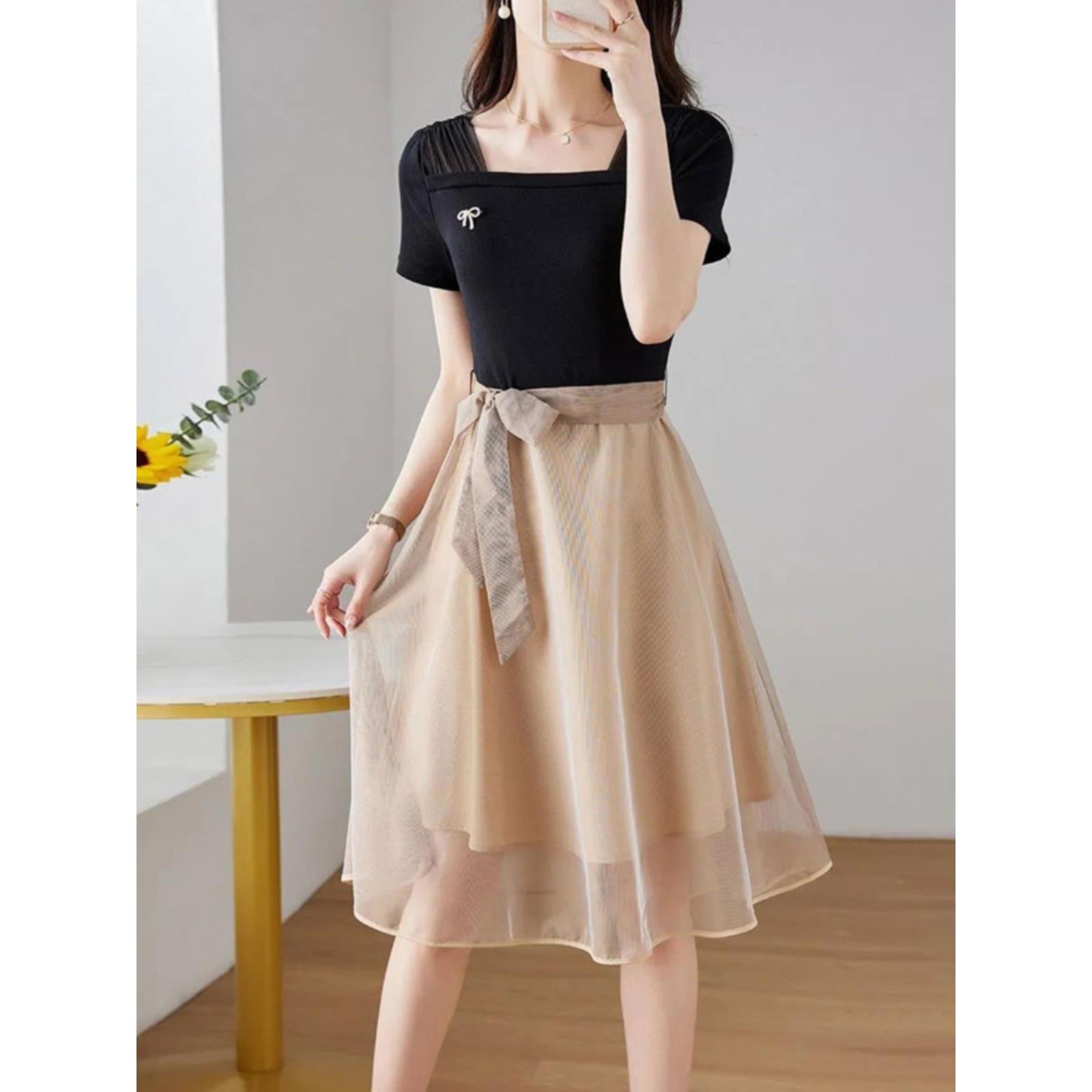 网纱拼接假两件连衣裙女2025夏装新款收腰显瘦小个子方领衬衫裙子