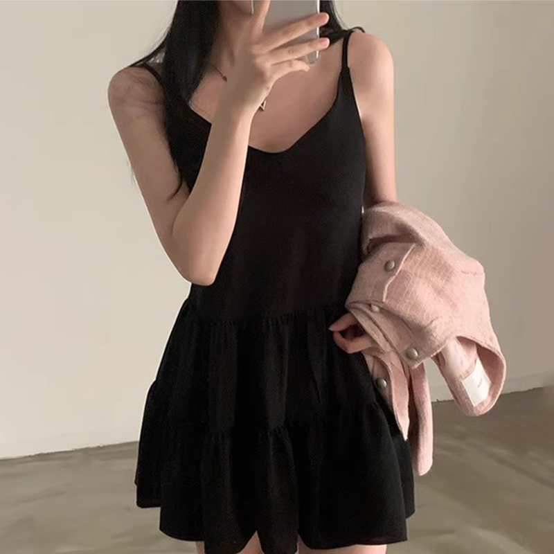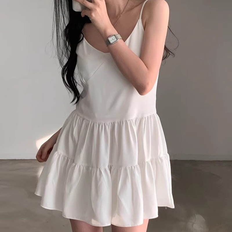 韩国chic春季法式简约V领纯色拼接褶皱高腰显瘦吊带连衣裙短裙女