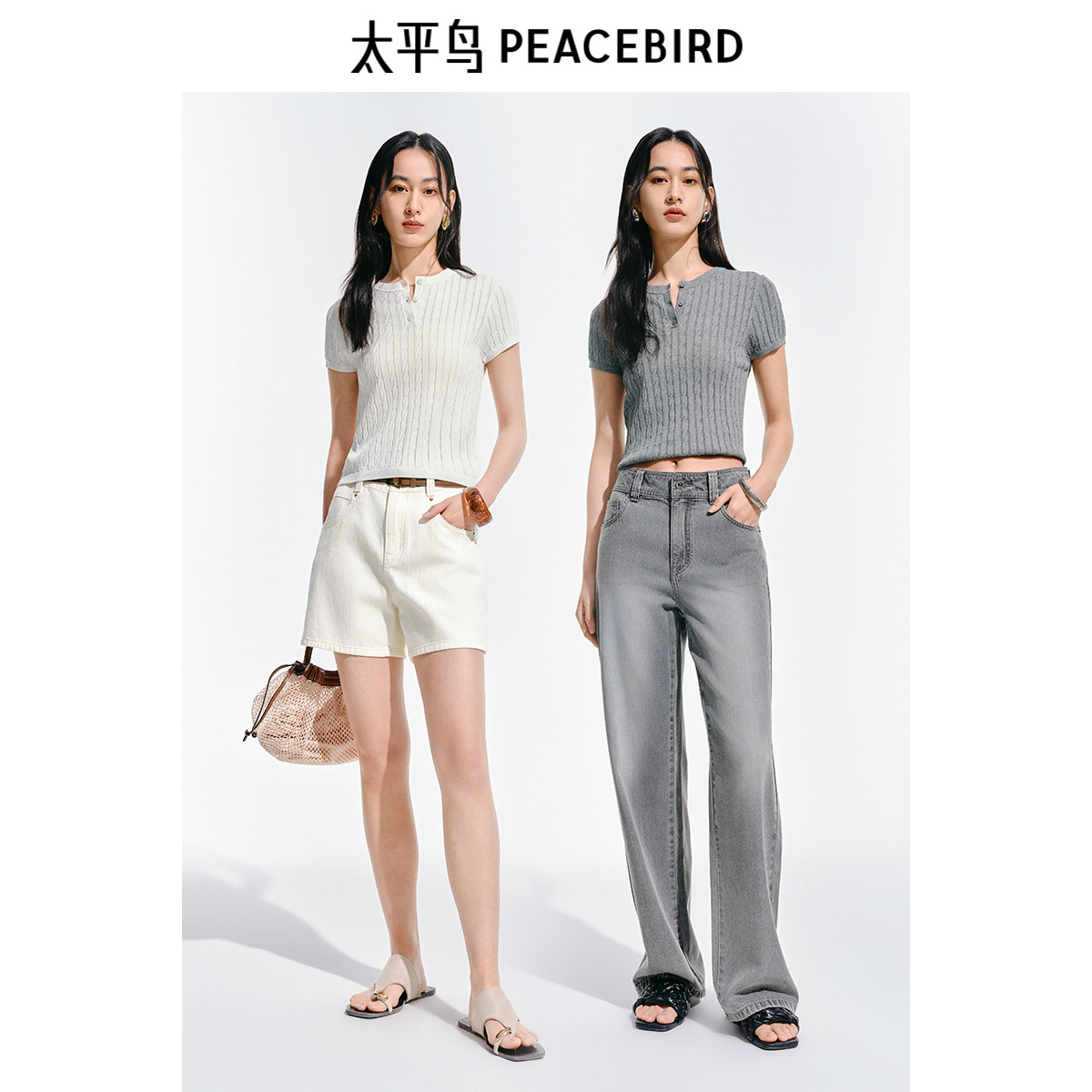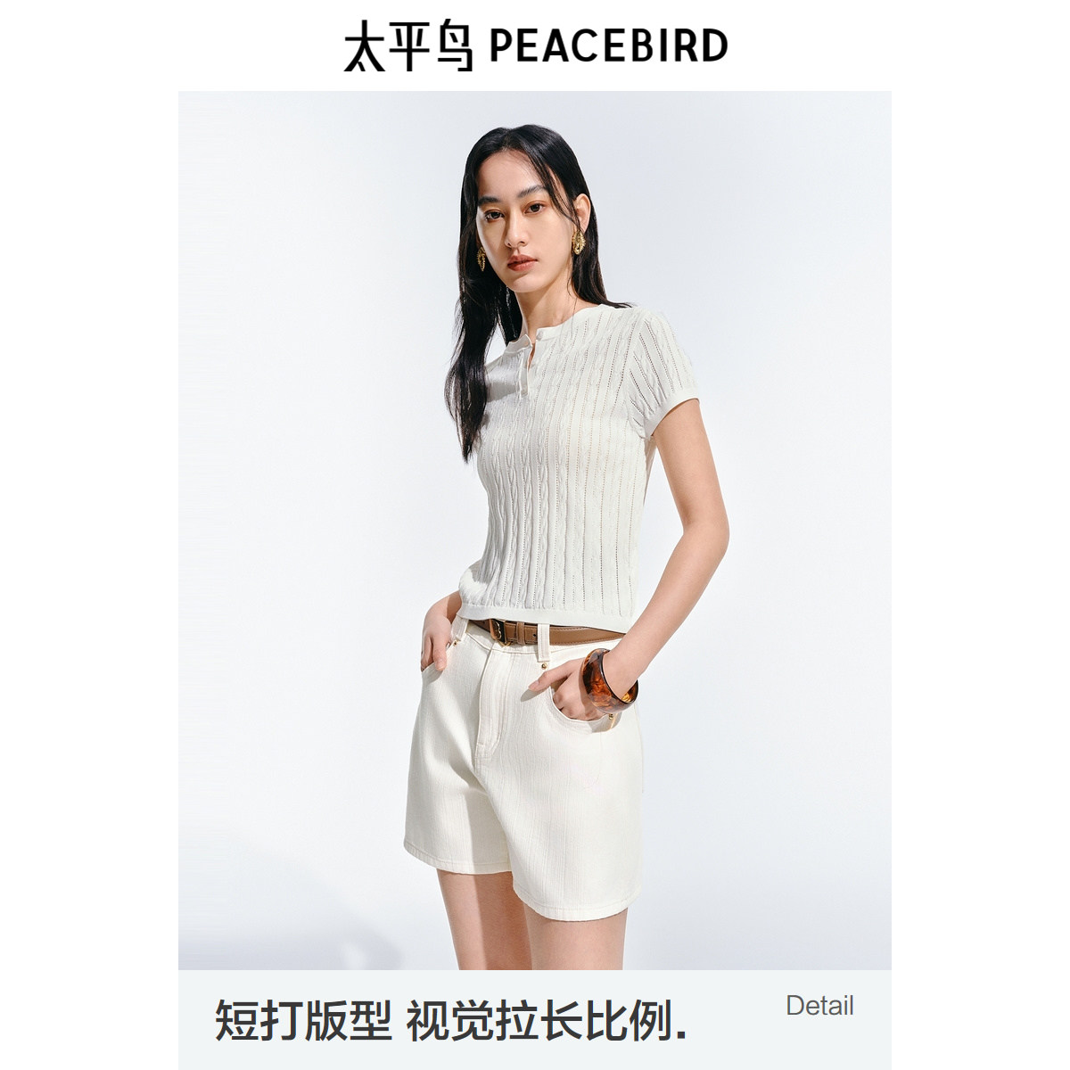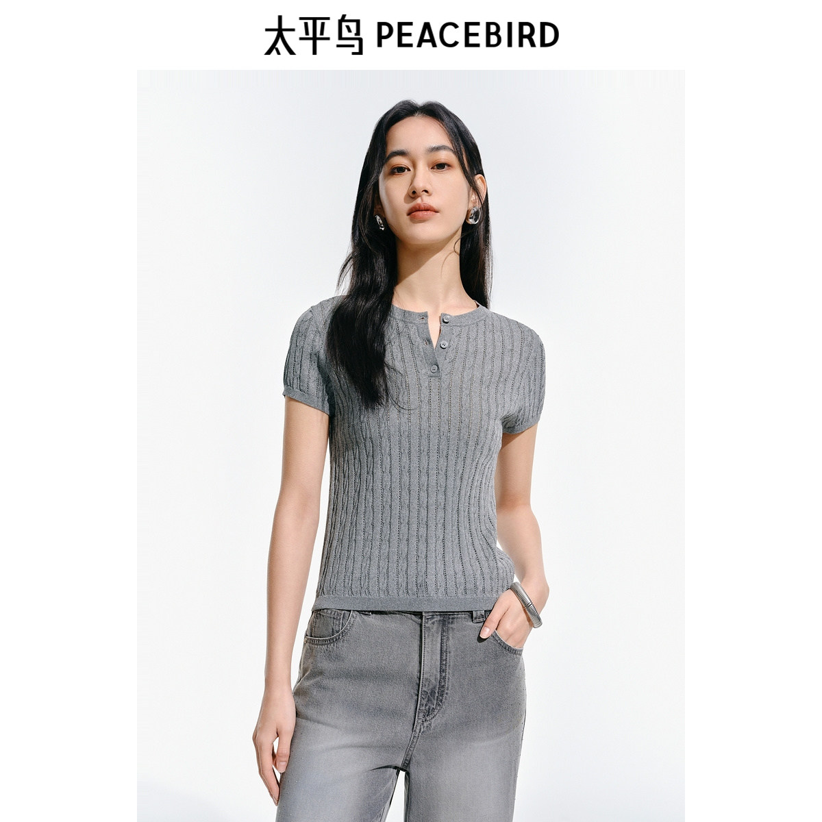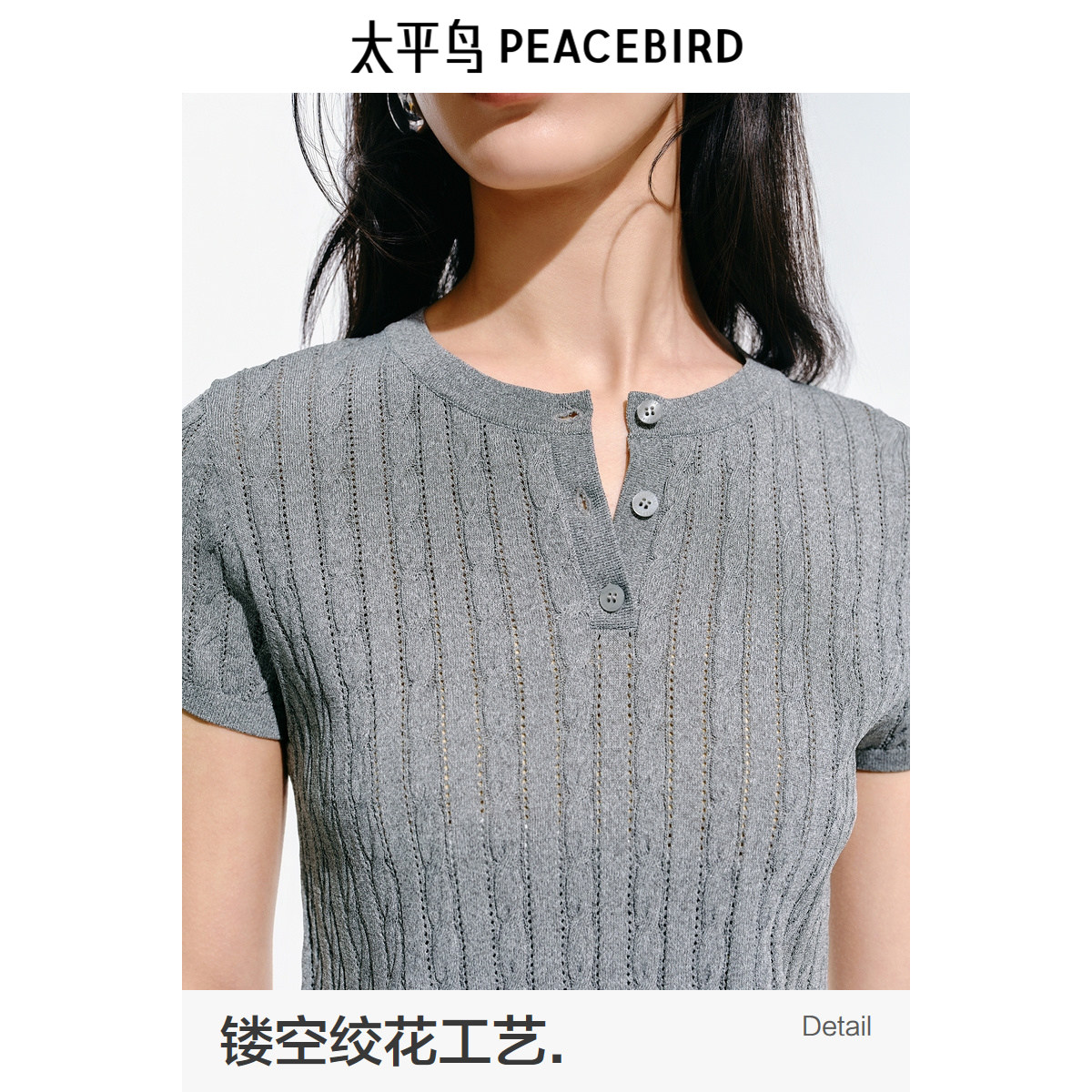 太平鸟 短袖V领绞花针织衫25夏季新款老钱风曲珠纱显瘦套衫上衣女