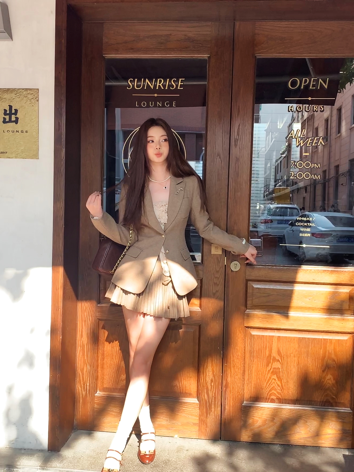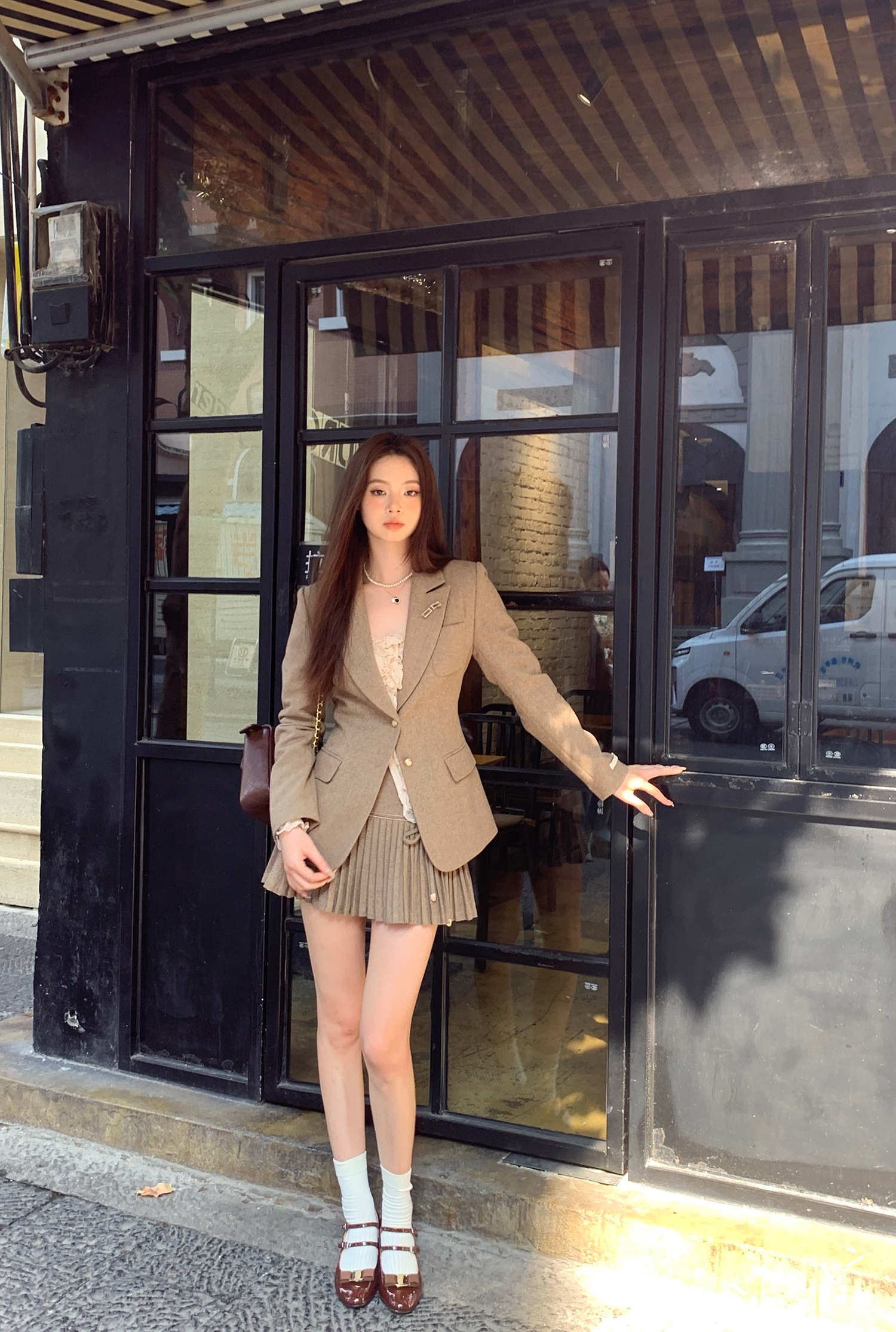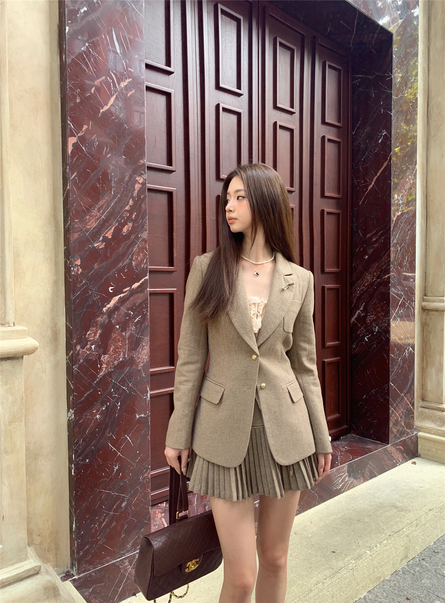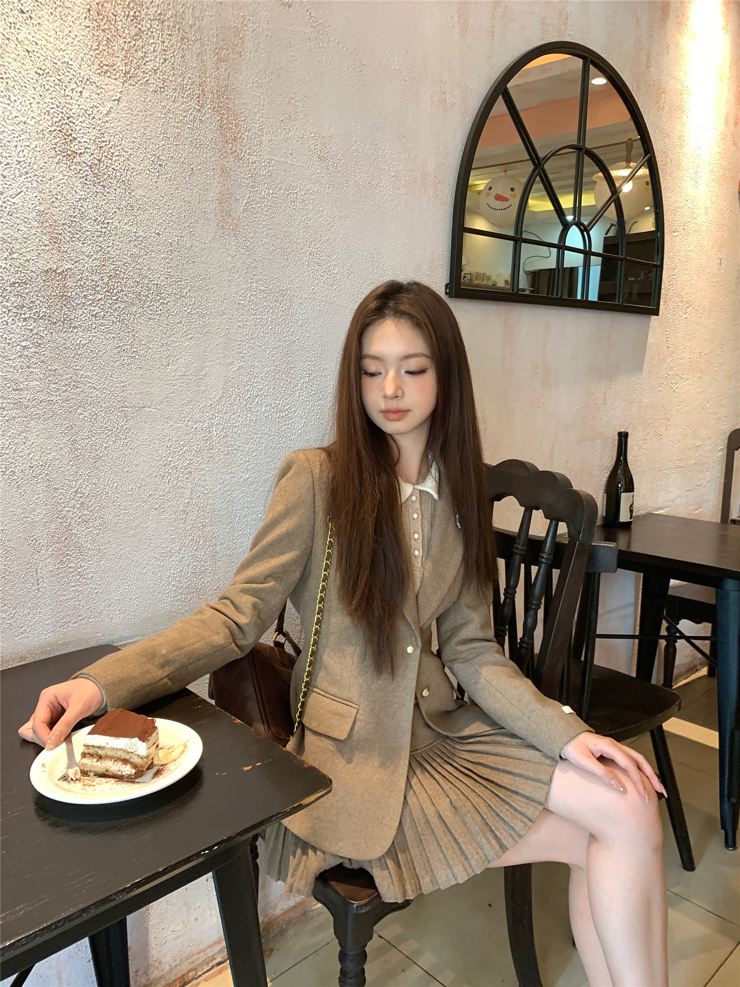 下蛋喵 秋季气质卡其色质感羊毛西装呢外套百褶裙套装两件套女