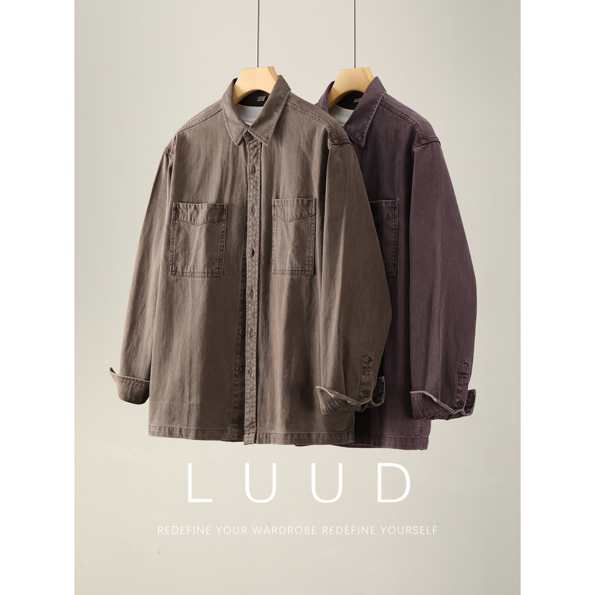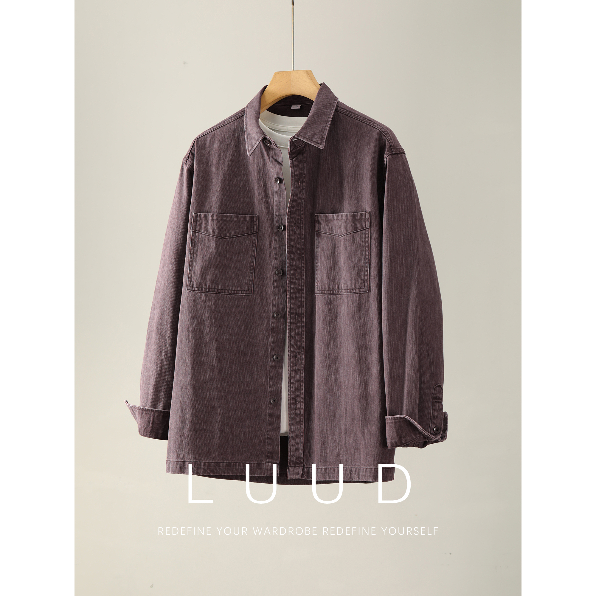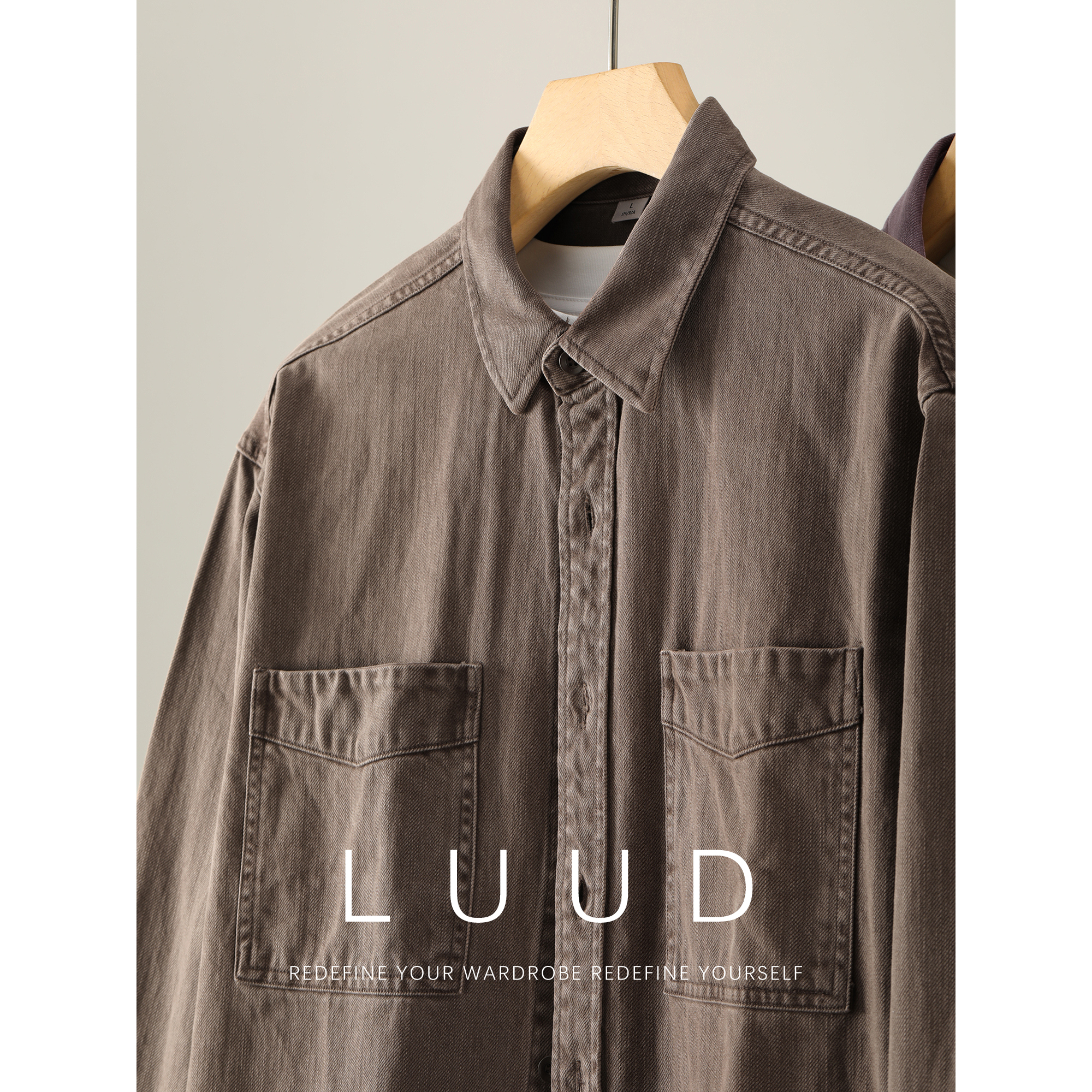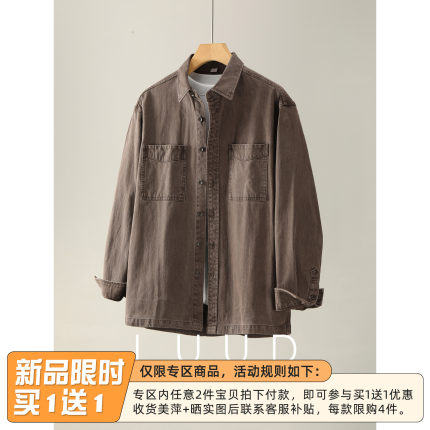 LUUD 复古风水洗做旧双贴袋牛仔衬衫男阿美咔叽100%纯棉衬衣夹克