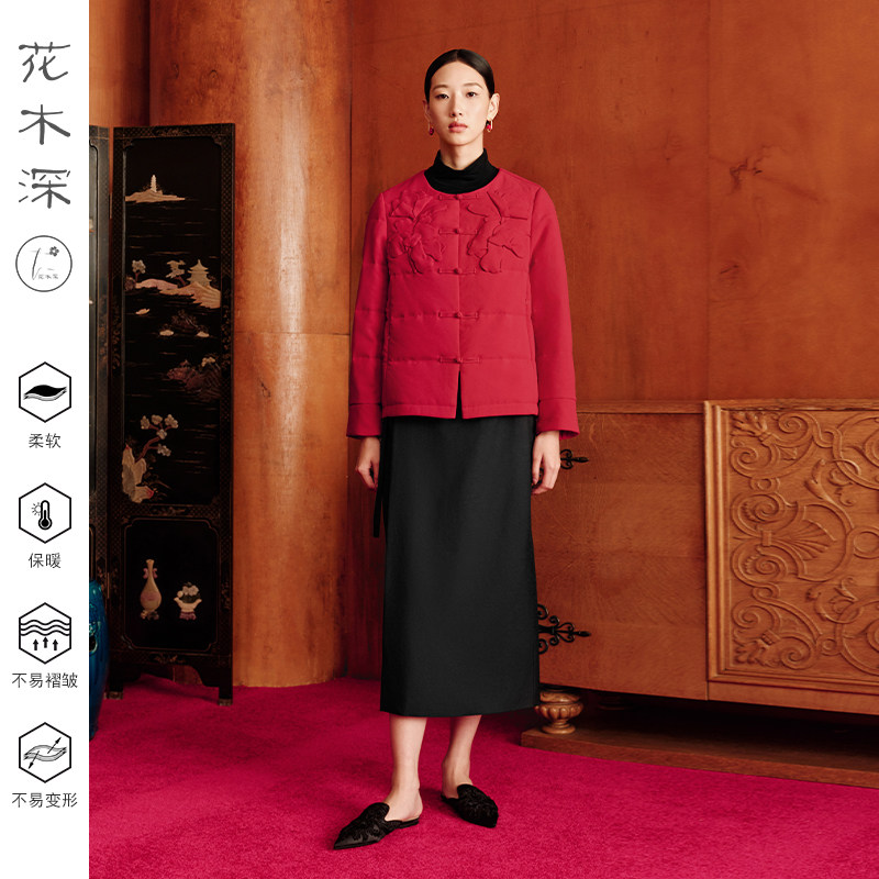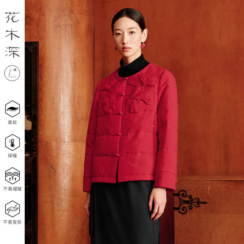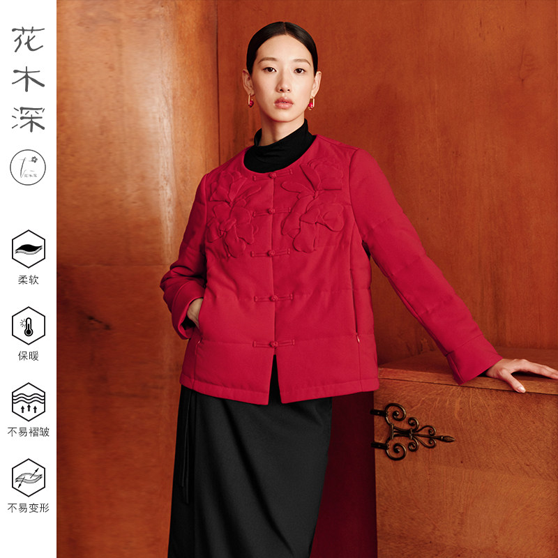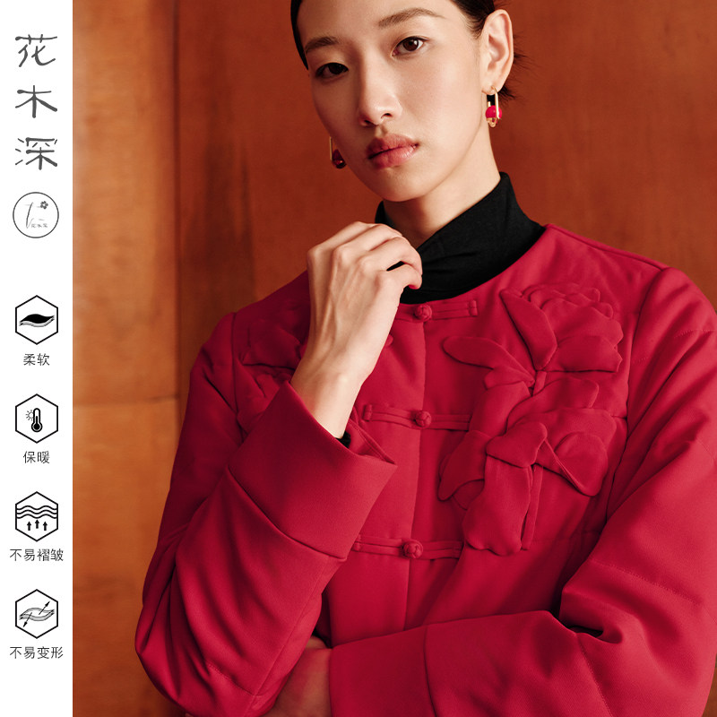 花木深新中式红色棉服醋酸圆领夹棉外套女款拜年服手工花盘扣棉衣