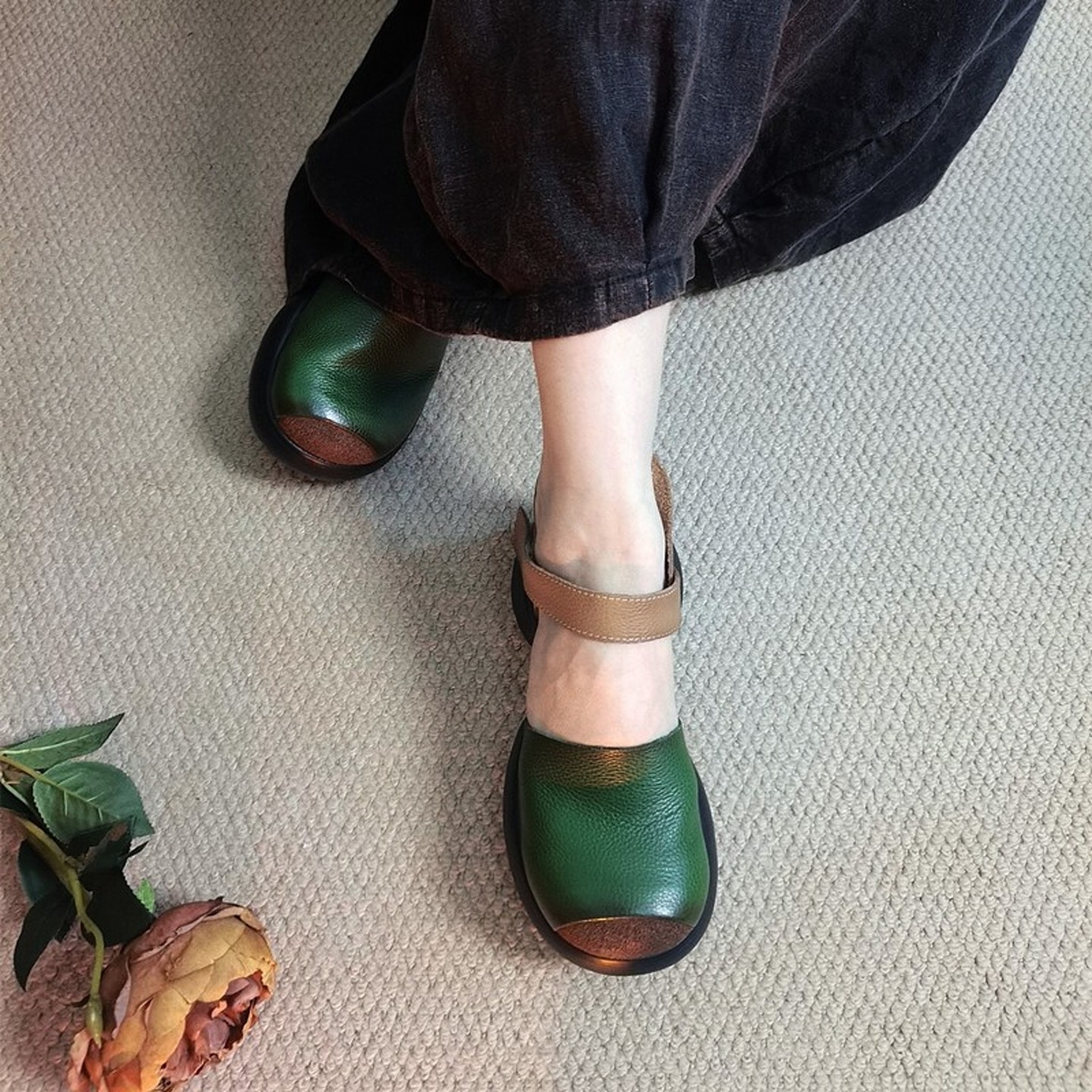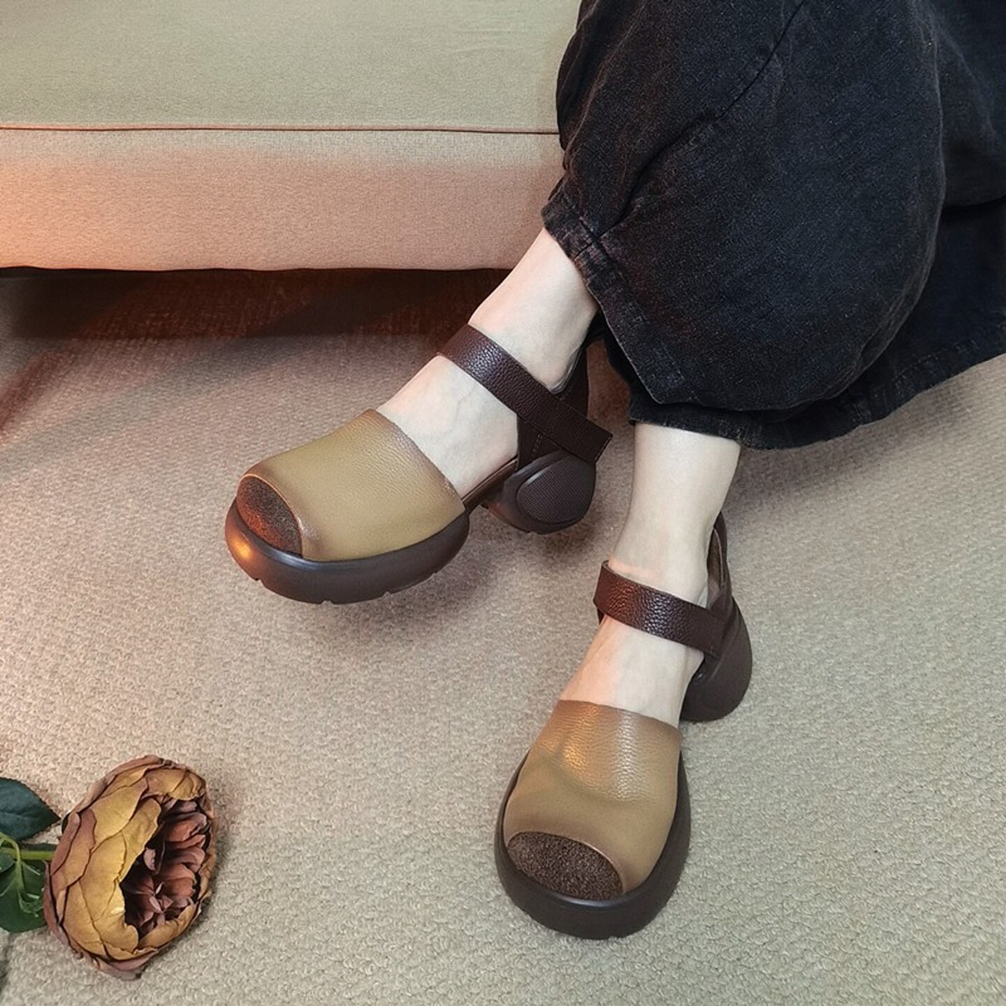 复古厚底粗跟包头凉鞋女四月倾城手工拼色坡跟方头魔术贴中空单鞋