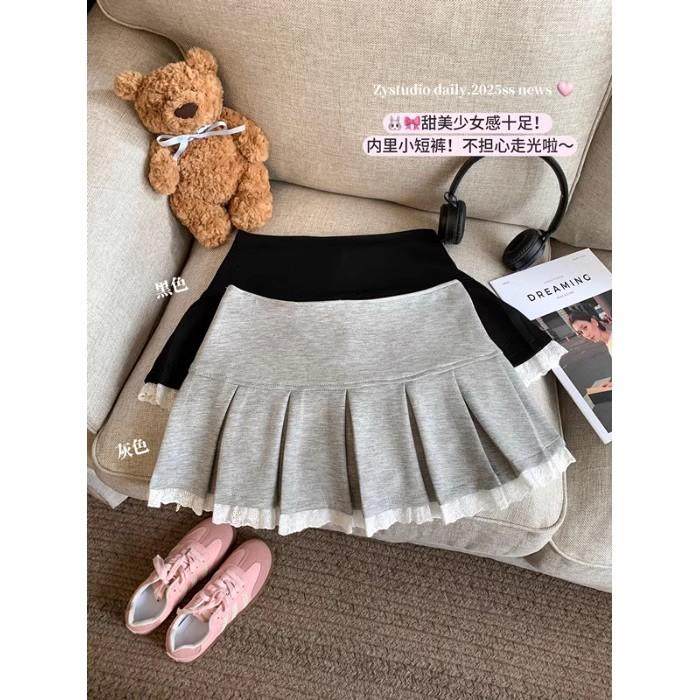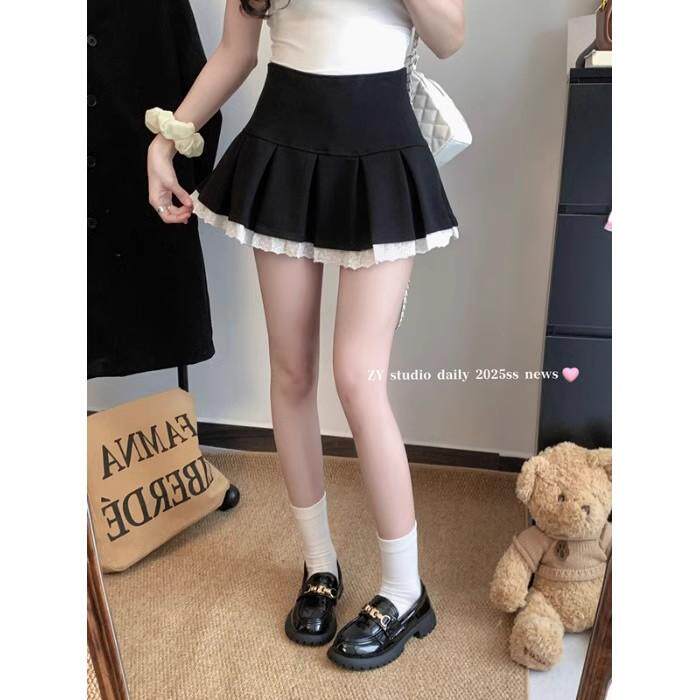 甜辣妹蕾丝拼接半身裙女春季短裙复古防走光百褶裙高腰显瘦A字裙
