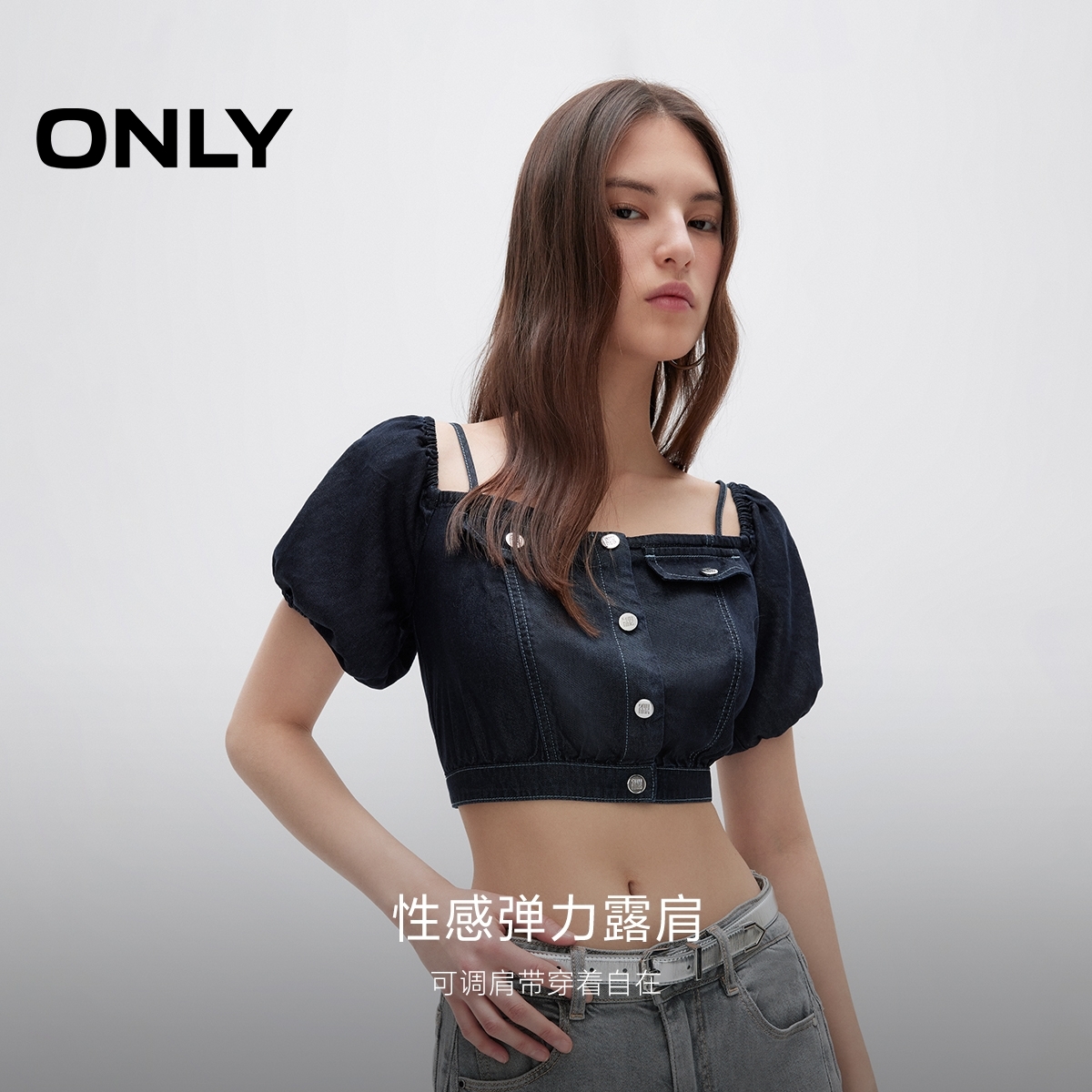 ONLY露肩牛仔短款吊带短袖T恤