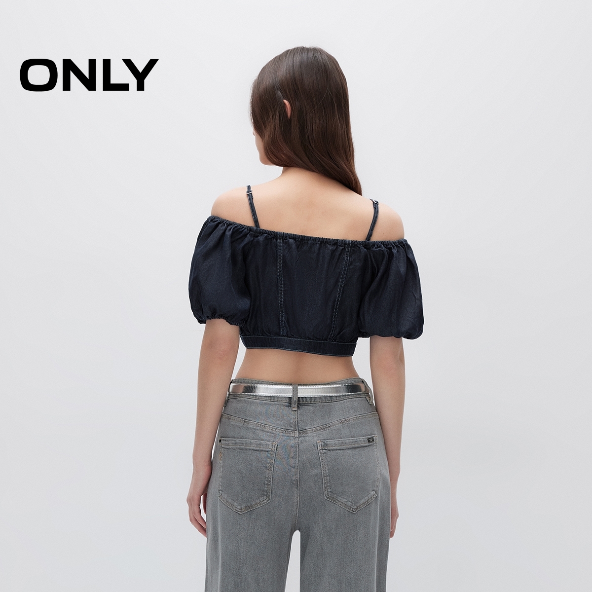 ONLY2025夏季新款性感露肩轻薄天丝牛仔面料短款吊带短袖T恤女