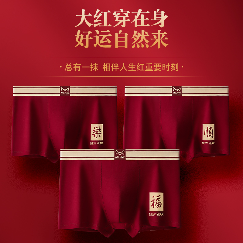 猫人本命年男士内裤纯棉抗菌四角裤男款红色蛇年结婚礼物平角短裤