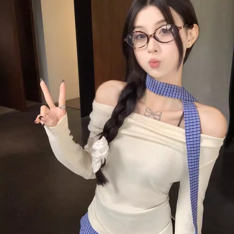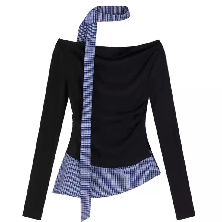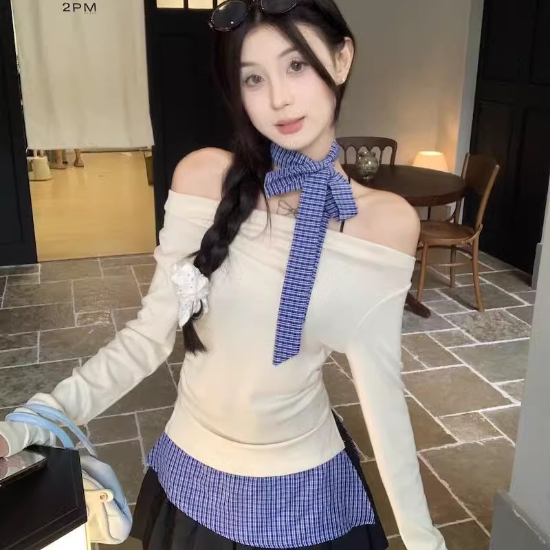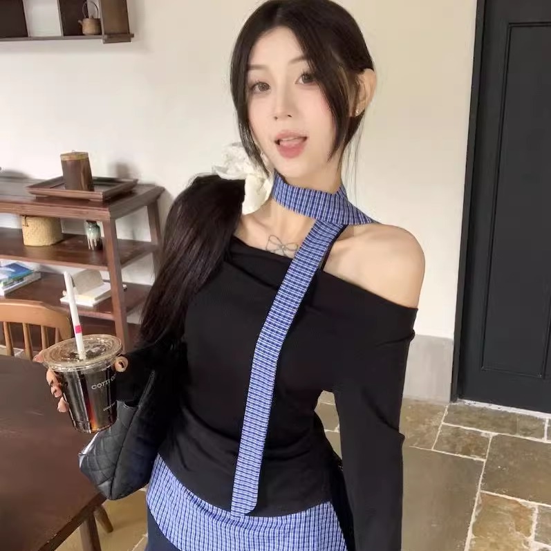 韩系假两件格子拼接挂脖打底衫女早秋chic设计感一字露肩T恤上衣