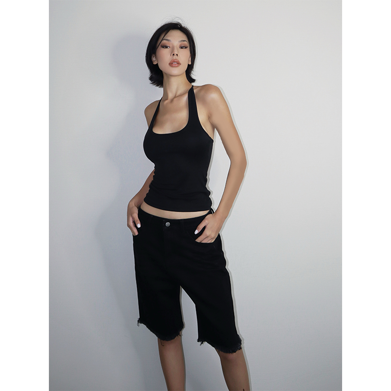 VanessaLab夏季黑色五分裤毛边百搭牛仔短裤女美式休闲复古直筒裤