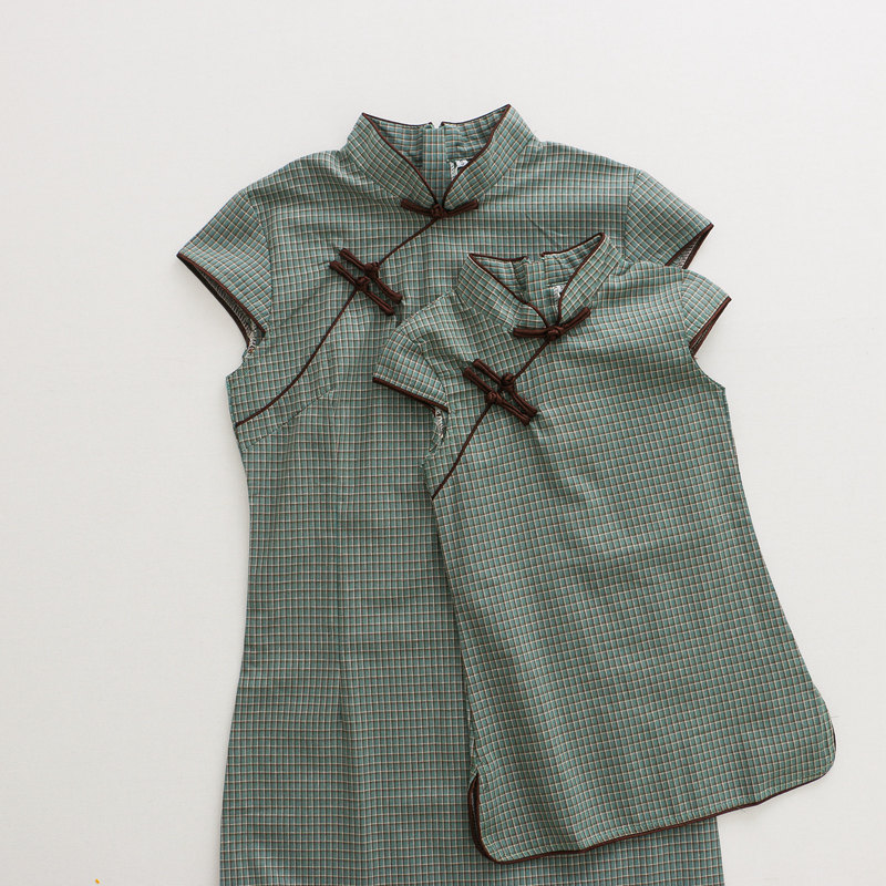 亲子母女装墨绿格子复古民国风女童短袖旗袍裙2023夏季文艺连衣裙