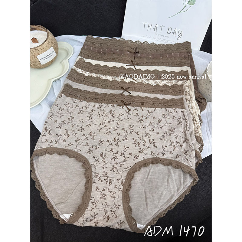 奥黛茉秋冬微磨毛咖色印花内裤女2025新款无痕中腰蕾丝边三角短款