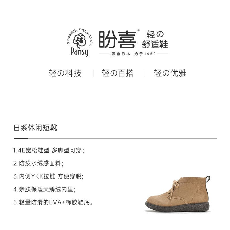 Pansy日本女鞋短靴单靴新款休闲轻便舒适高帮鞋拉链靴子秋冬季