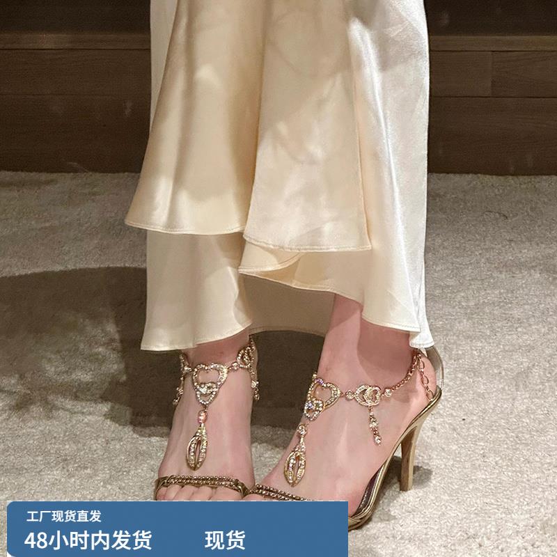 法式新款露趾水钻爱心链条高跟鞋女细跟性感宴会名媛一字带凉鞋夏