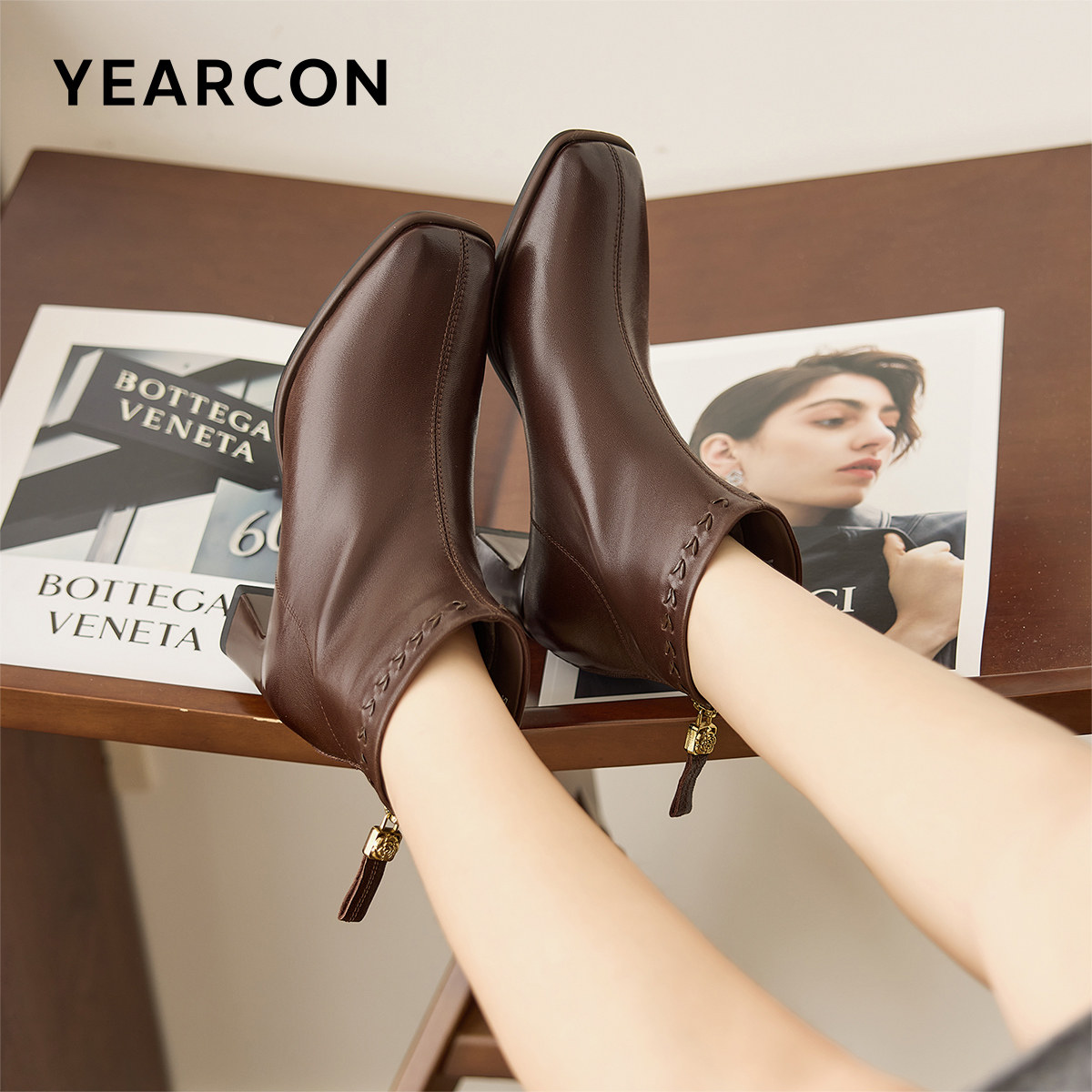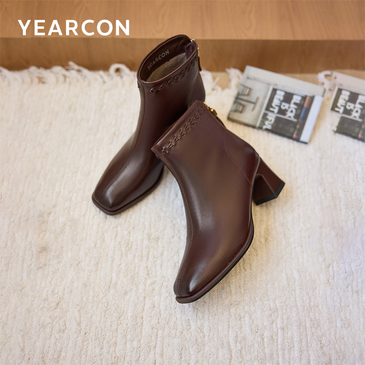 意尔康女靴冬季新款方头短靴女粗跟真皮显瘦百搭时装靴瘦瘦靴子